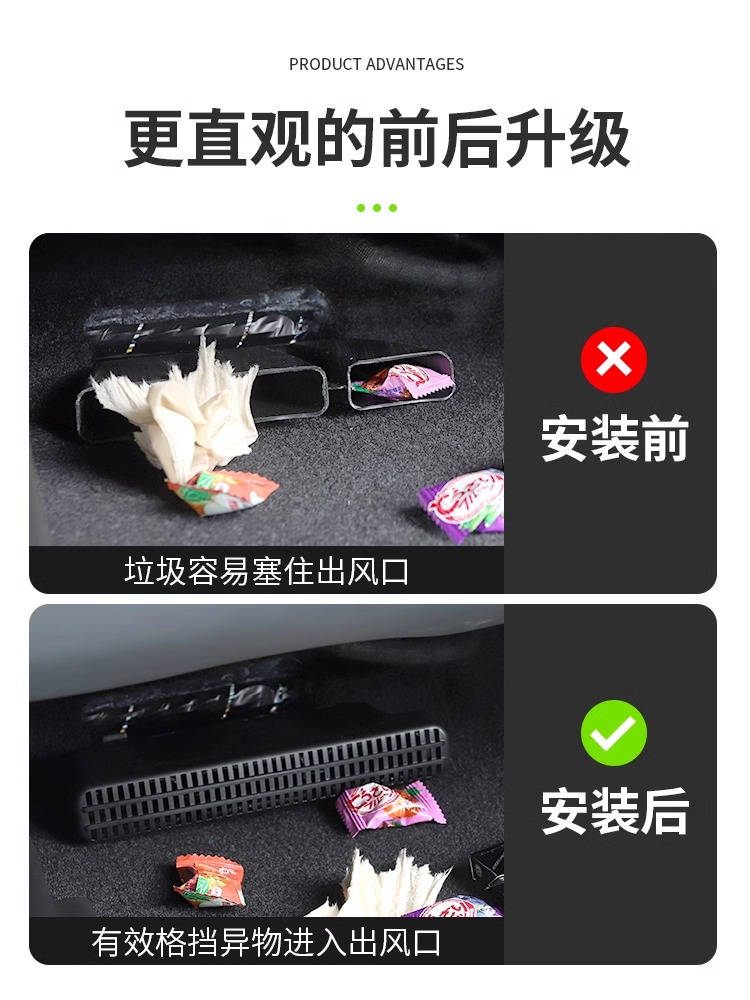 - Performance-Driven Design: Effectively protects the rear air conditioning outlet from blockages and dust accumulation without affecting air volume, as shown in the picture.