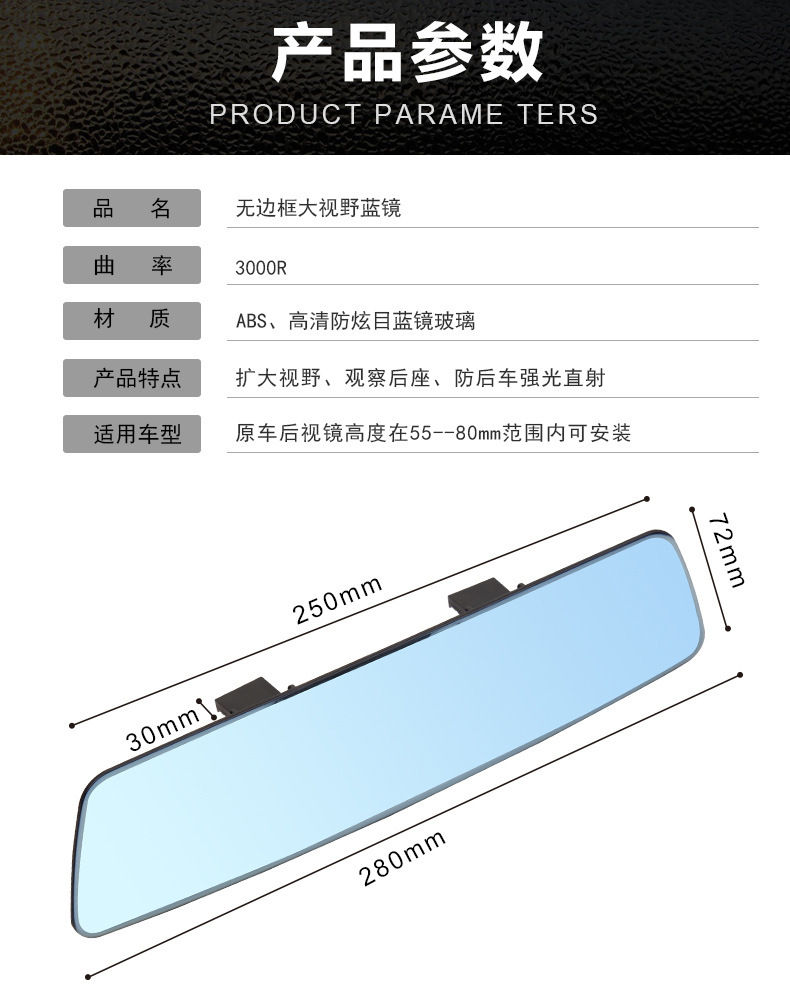 - Anti-Glare Blue Mirror: Features a high-quality anti-glare blue tint mirror surface that effectively reduces harsh headlight glare from vehicles behind, ensuring comfortable night driving.