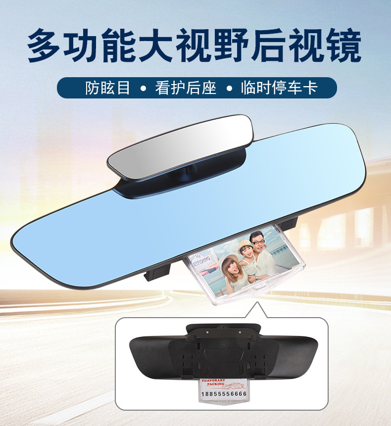 - Multi-functional Design: Integrates a unique 3-in-1 functionality including a wide-angle rear view mirror, a back seat observation mirror, and a temporary parking plate/photo frame, offering versatile utility.