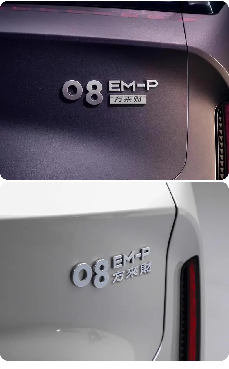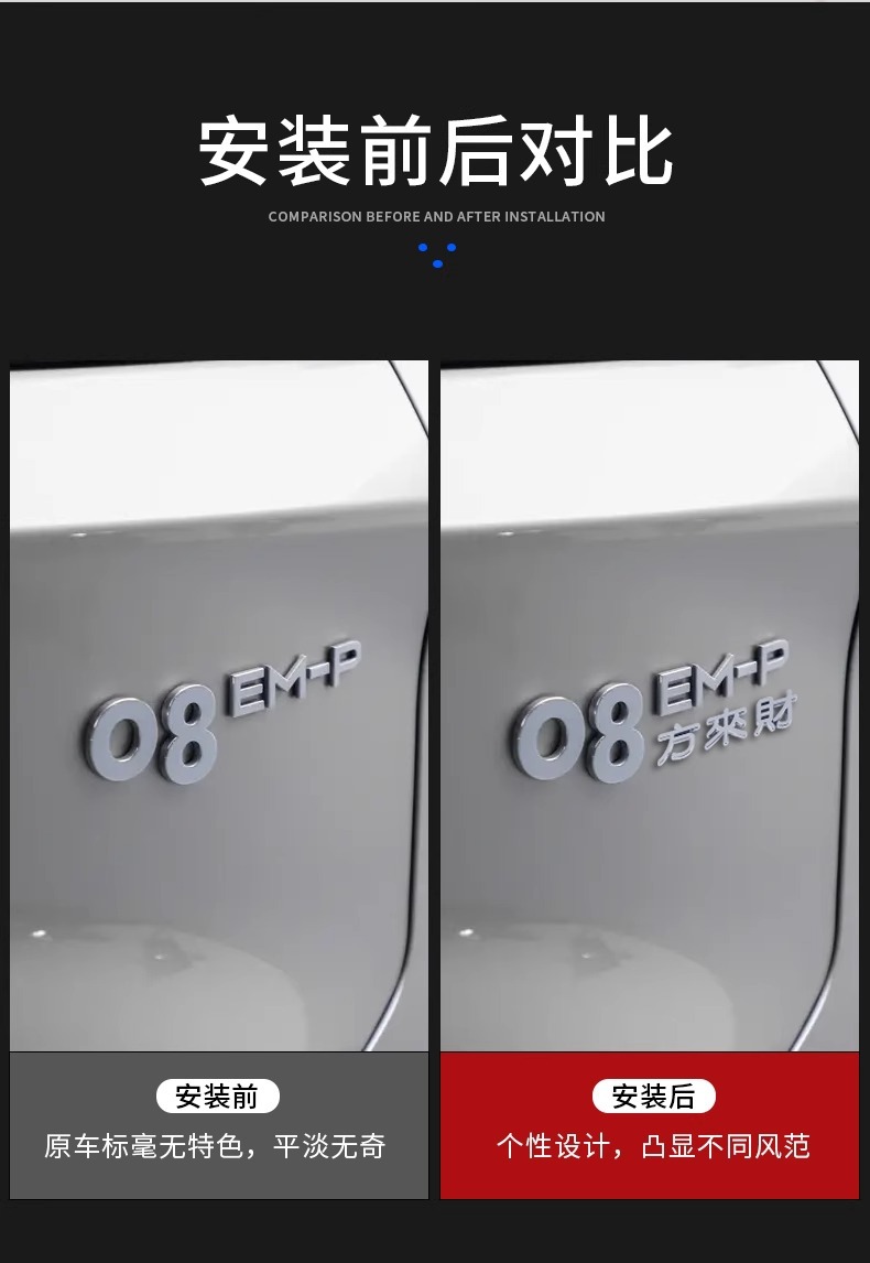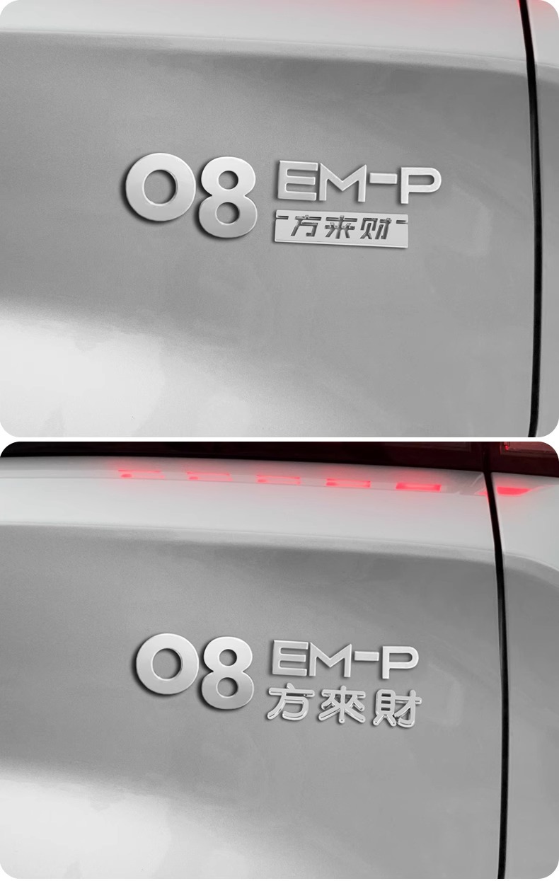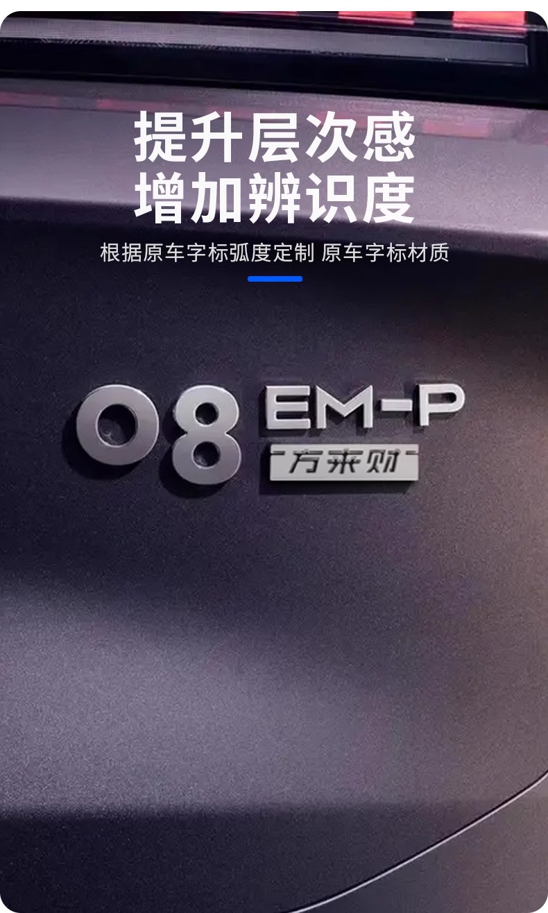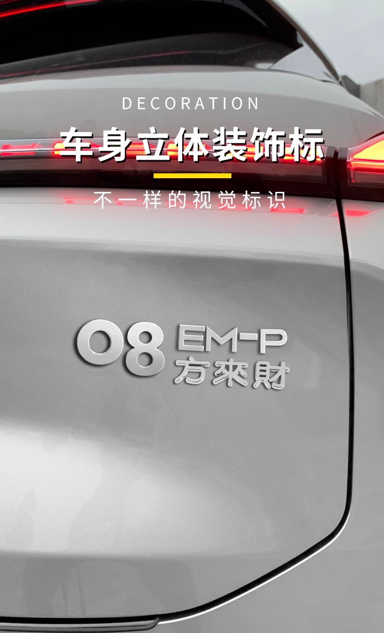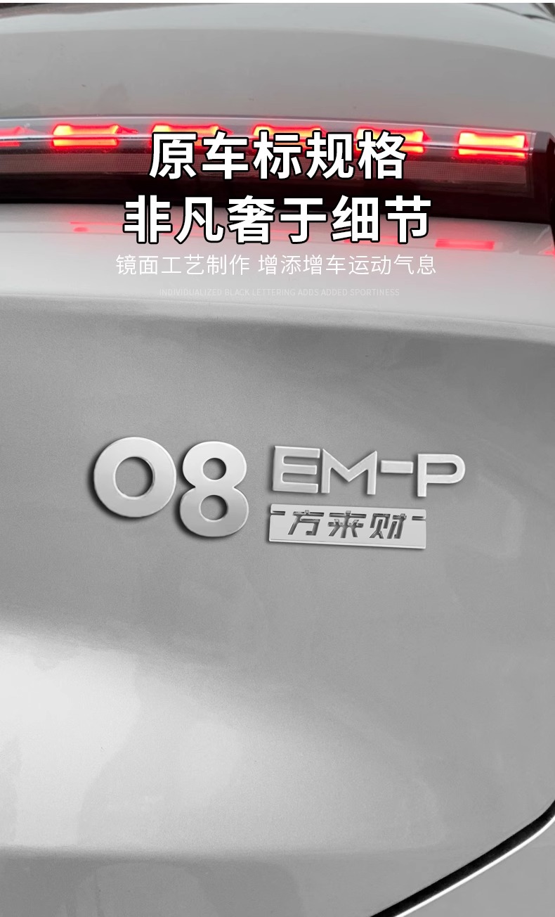 - Performance-Driven Design: Enhances the vehicle’s aesthetic with a unique “8-Directions Wealth” emblem and prominent “08 EM-P” lettering, adding a personalized touch.