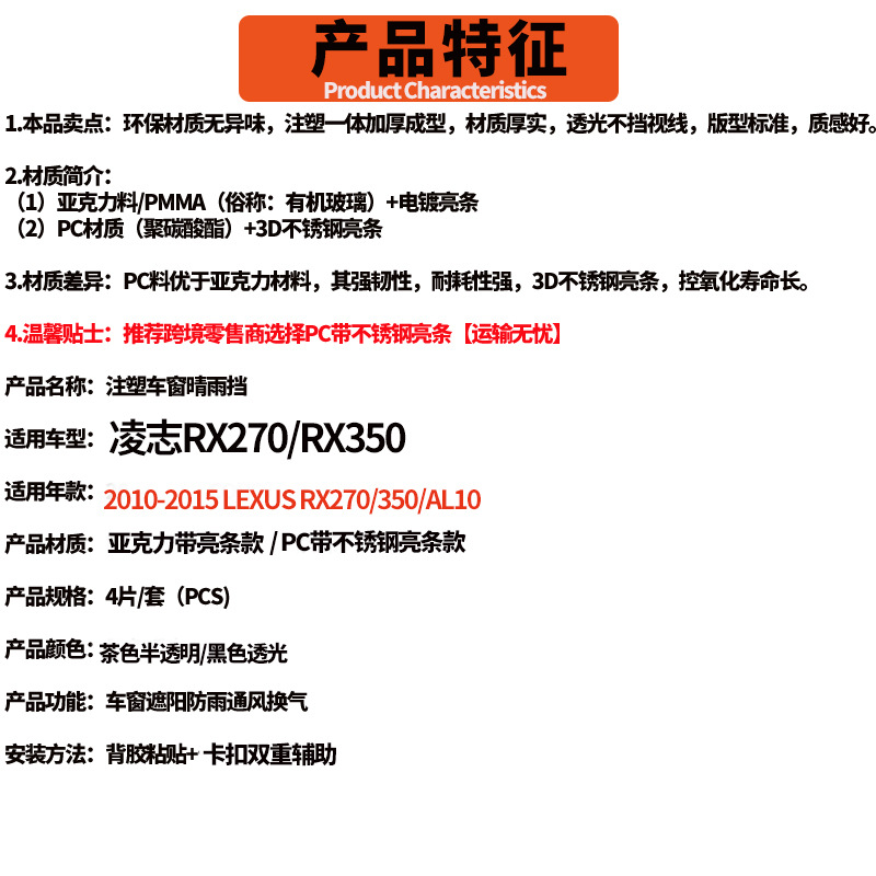 4PCS Window Visors Rain Guard Deflector for Lexus RX270 RX350 AL10 2010-2015