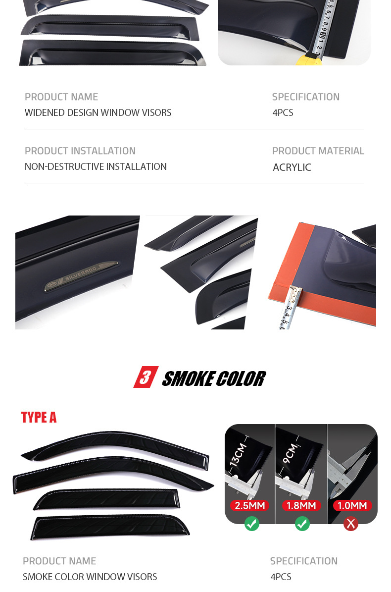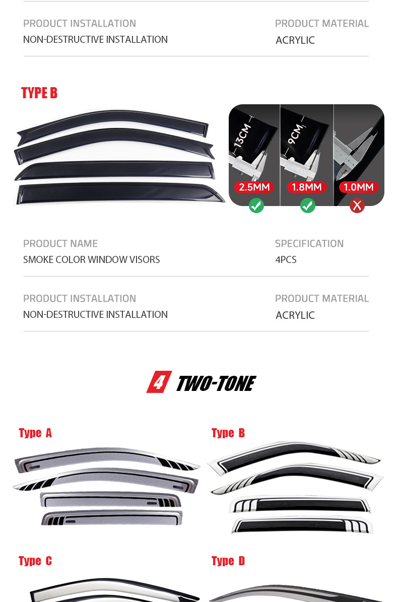 - Complete Package: Includes 4x window deflectors (2 front, 2 rear), exactly as pictured, to equip all side windows of your vehicle. Please verify fitment details before purchasing.
