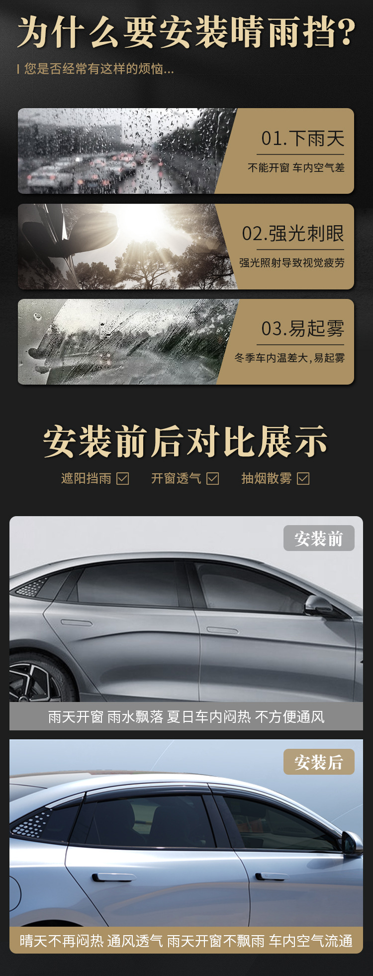 - Enhanced Protection: Provides effective rain and sun shielding for your car windows, improving driving comfort and visibility.