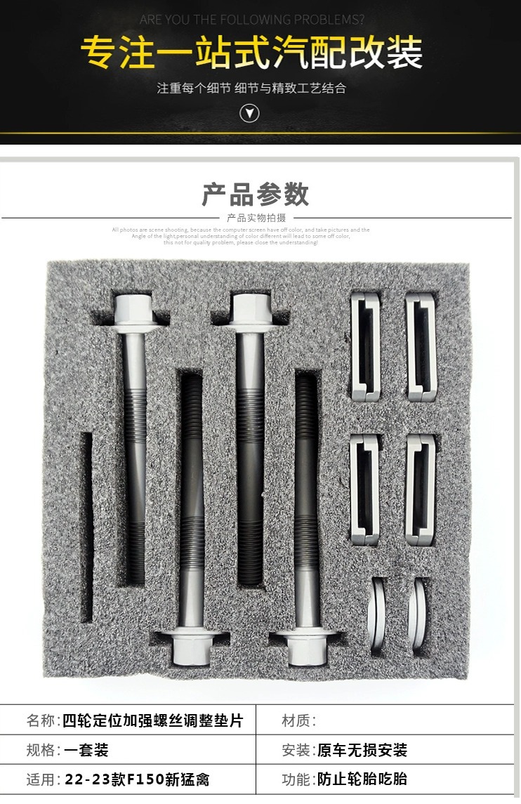 - Complete Kit: Each kit includes all necessary components for a full axle alignment adjustment, providing a comprehensive solution for your Ford F-150 Raptor.