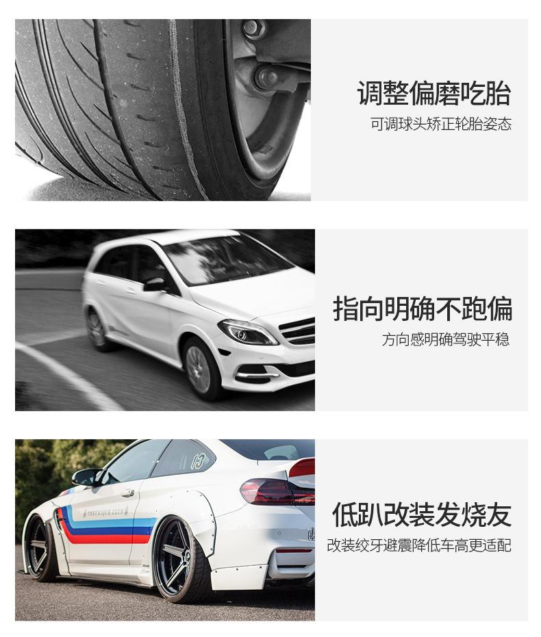 - Enhanced Driving Performance: Features adjustable camber and toe settings (±3 degrees), allowing for precise alignment to correct tire wear (tire eating), improve handling, and optimize vehicle stability.