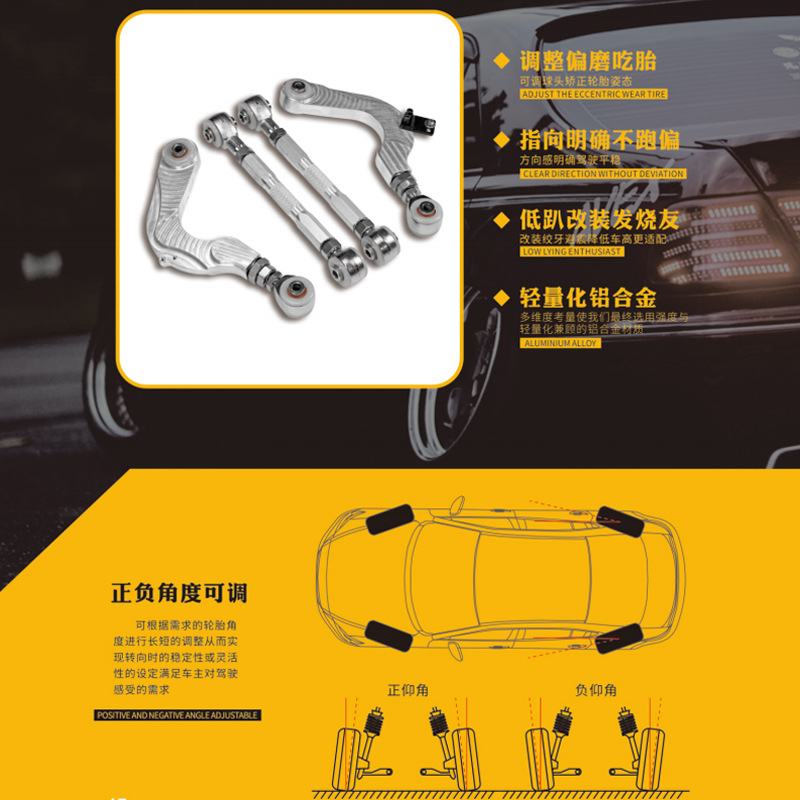 - Adjustable Angle Design: Features an adjustable lower control arm design, allowing for precise customization of camber and toe settings to enhance handling, tire wear, and overall driving stability.