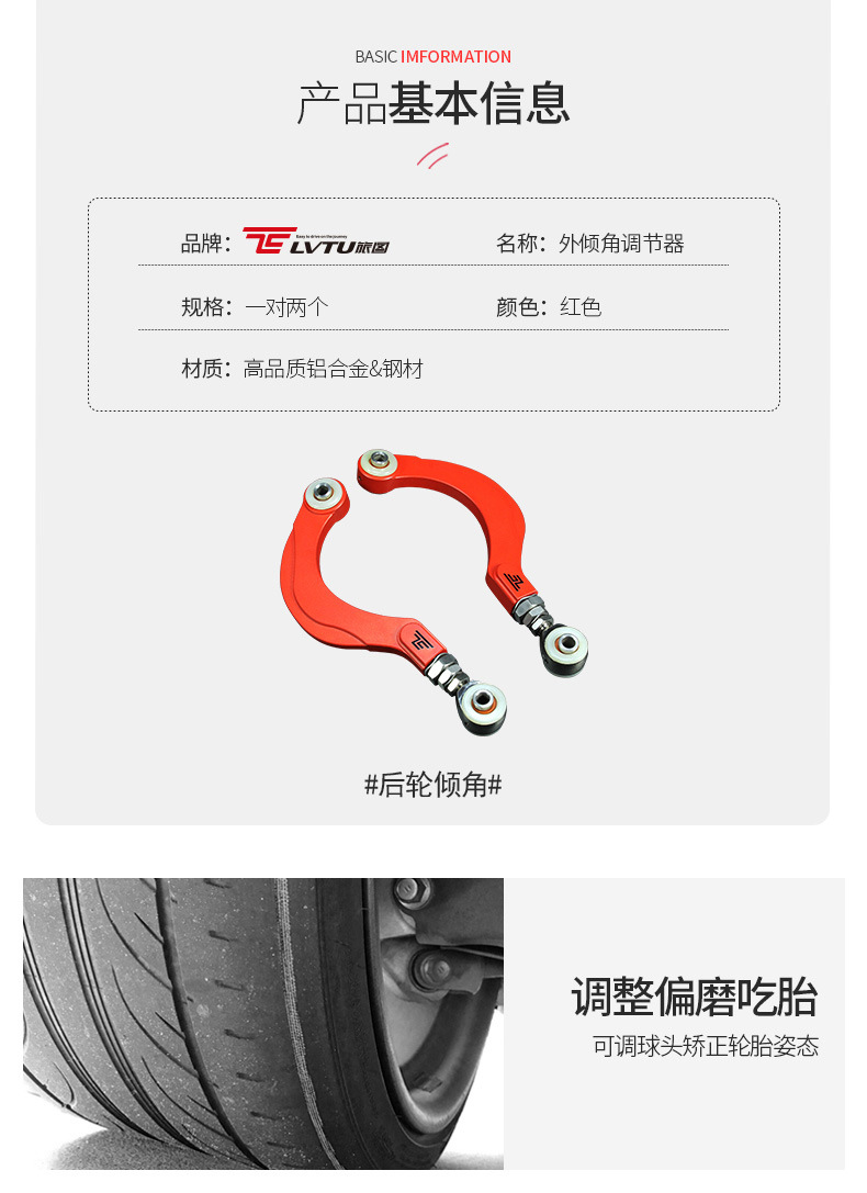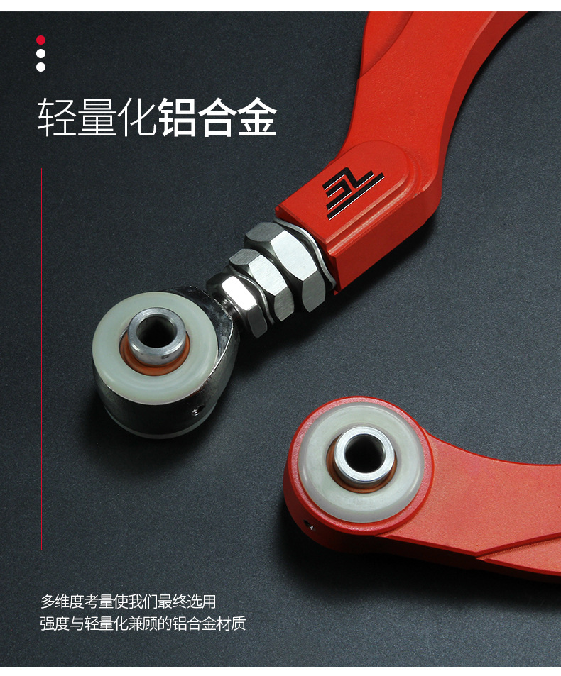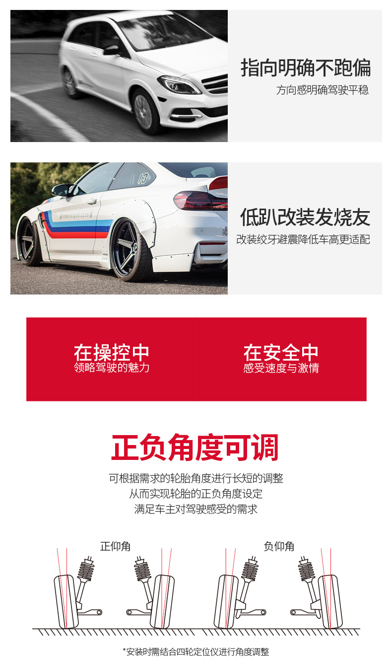 - Enhanced Adjustability: Features adjustable camber (±3°) and caster (±3°) for precise alignment tuning, allowing for improved handling and tire wear optimization.
