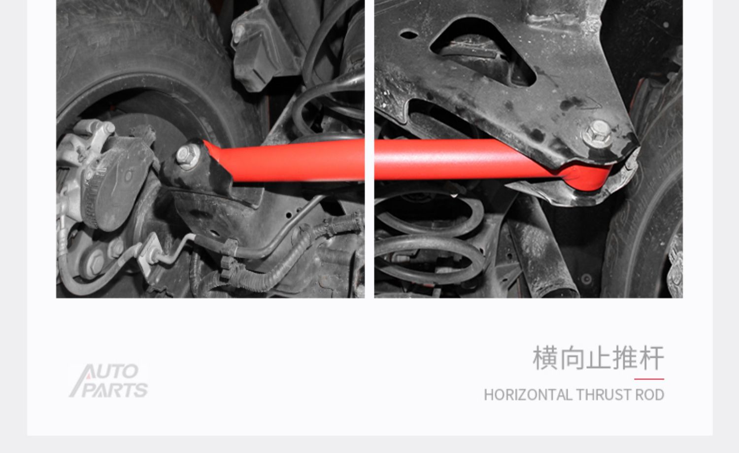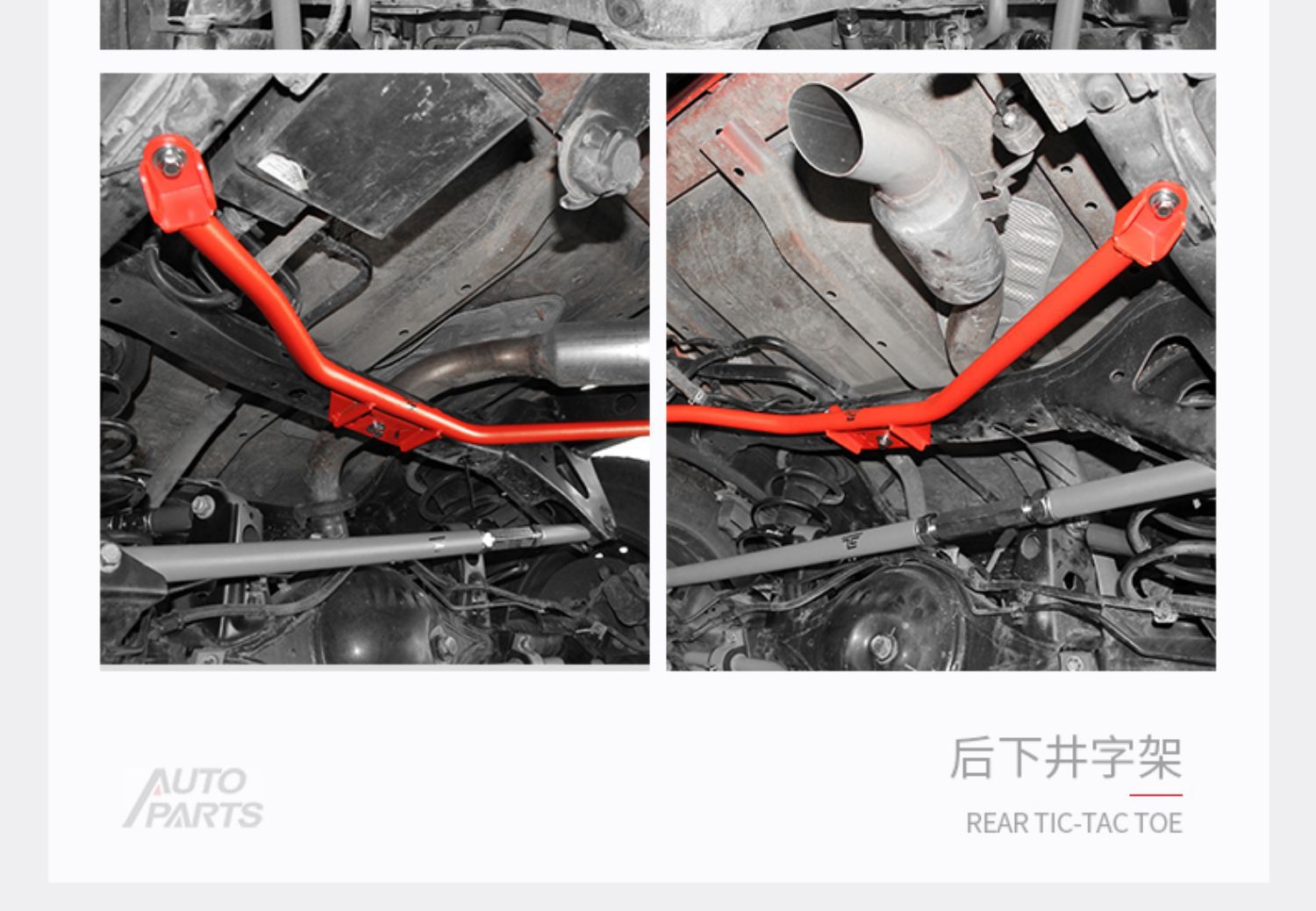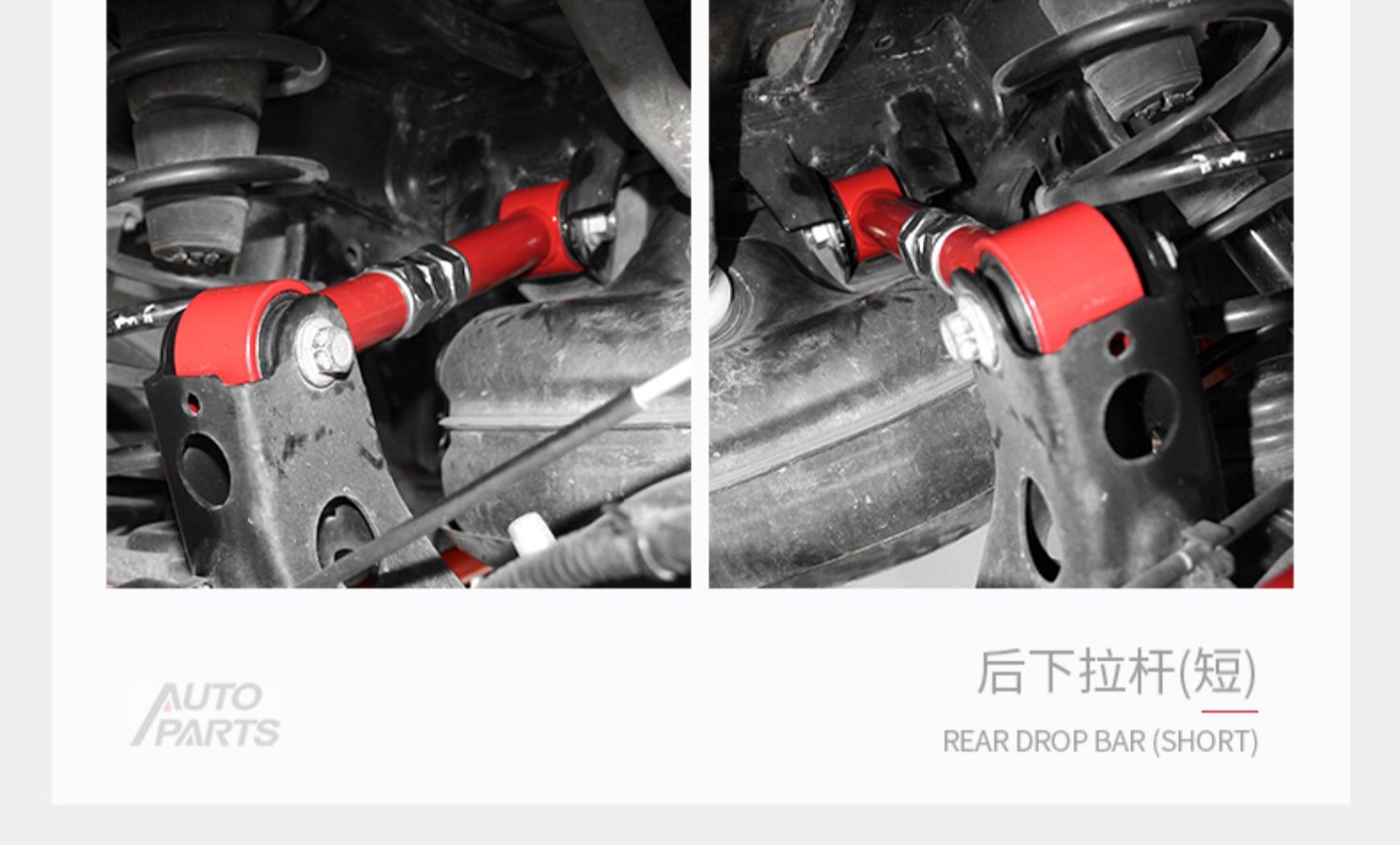 - Comprehensive Chassis Upgrade: This package includes various reinforced components such as front and rear lower control arms, front and rear end links, and a rear subframe brace (rear lower cross brace), providing a full suspension enhancement.