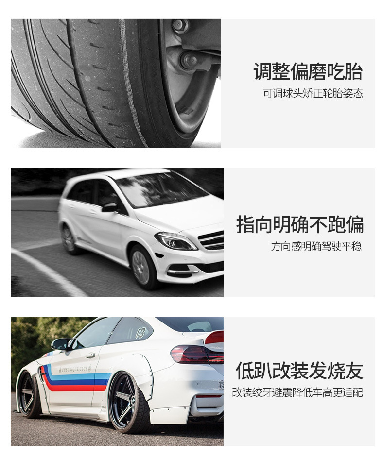 - Enhanced Handling & Performance: Allow precise adjustment of camber (-3° to +3°) and toe (-3° to +3°), optimizing tire contact patch, improving cornering stability, and reducing abnormal tire wear.