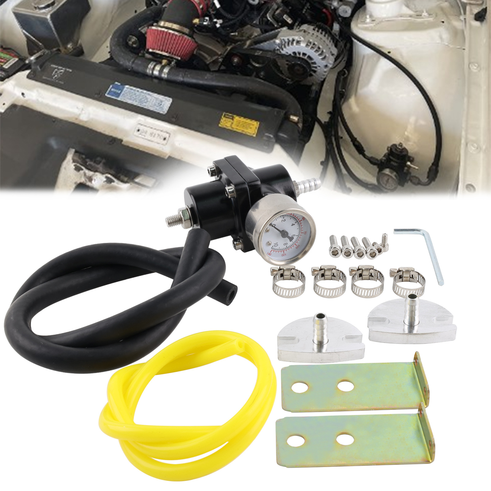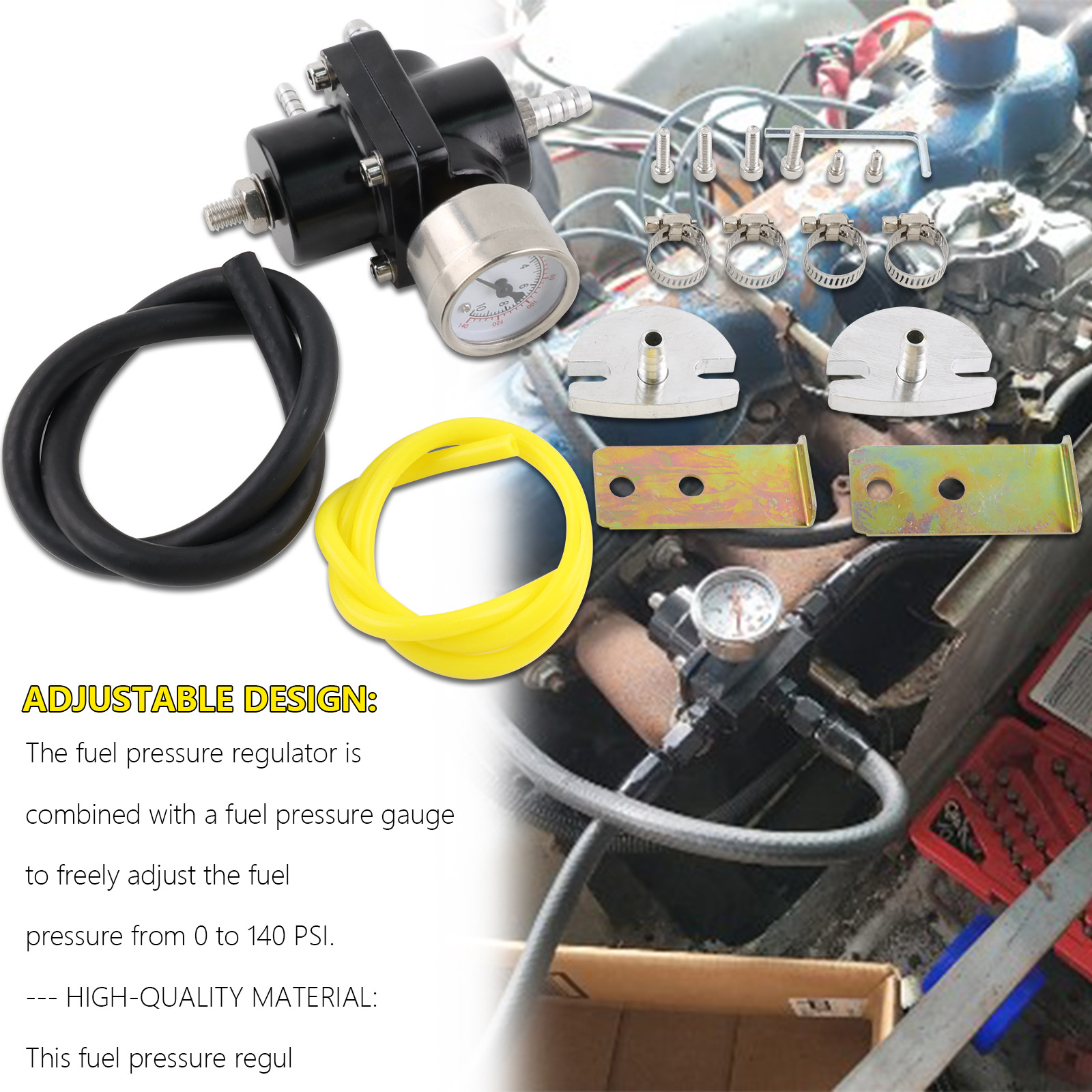 Adjustable Fuel Pressure Regulator Kit with Gauge (PSI), Hose, and Fittings for Automotive Performance Power Enhancement.