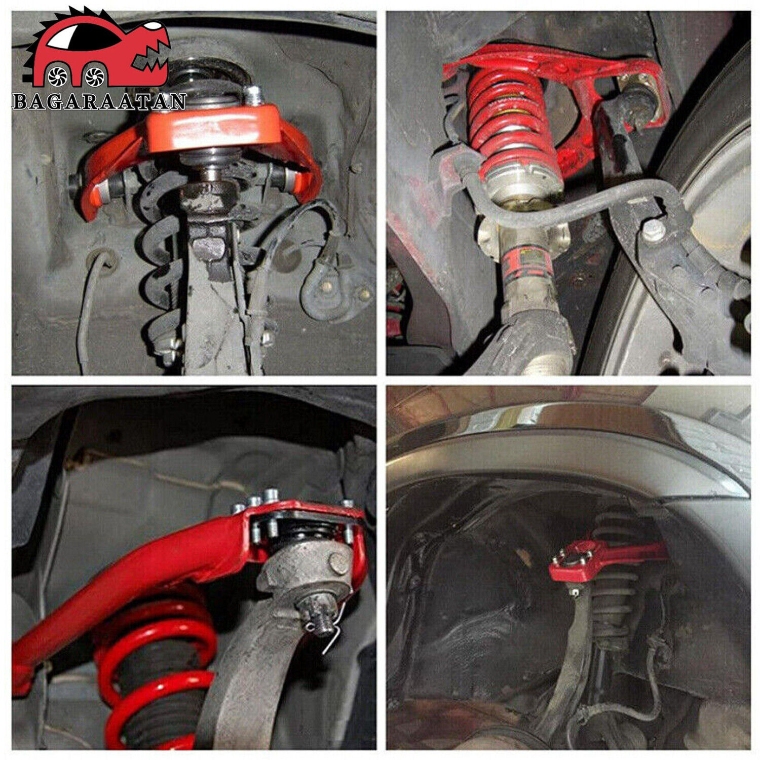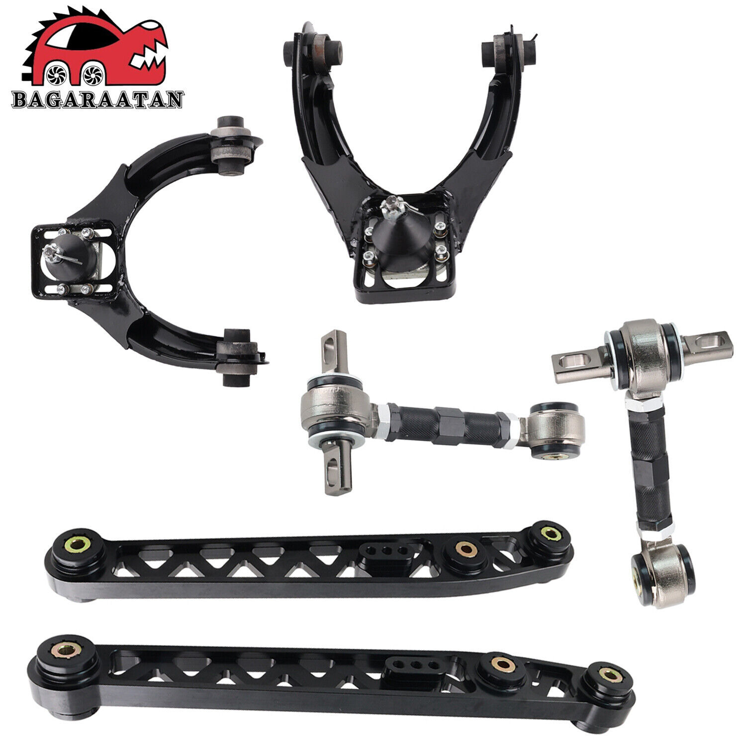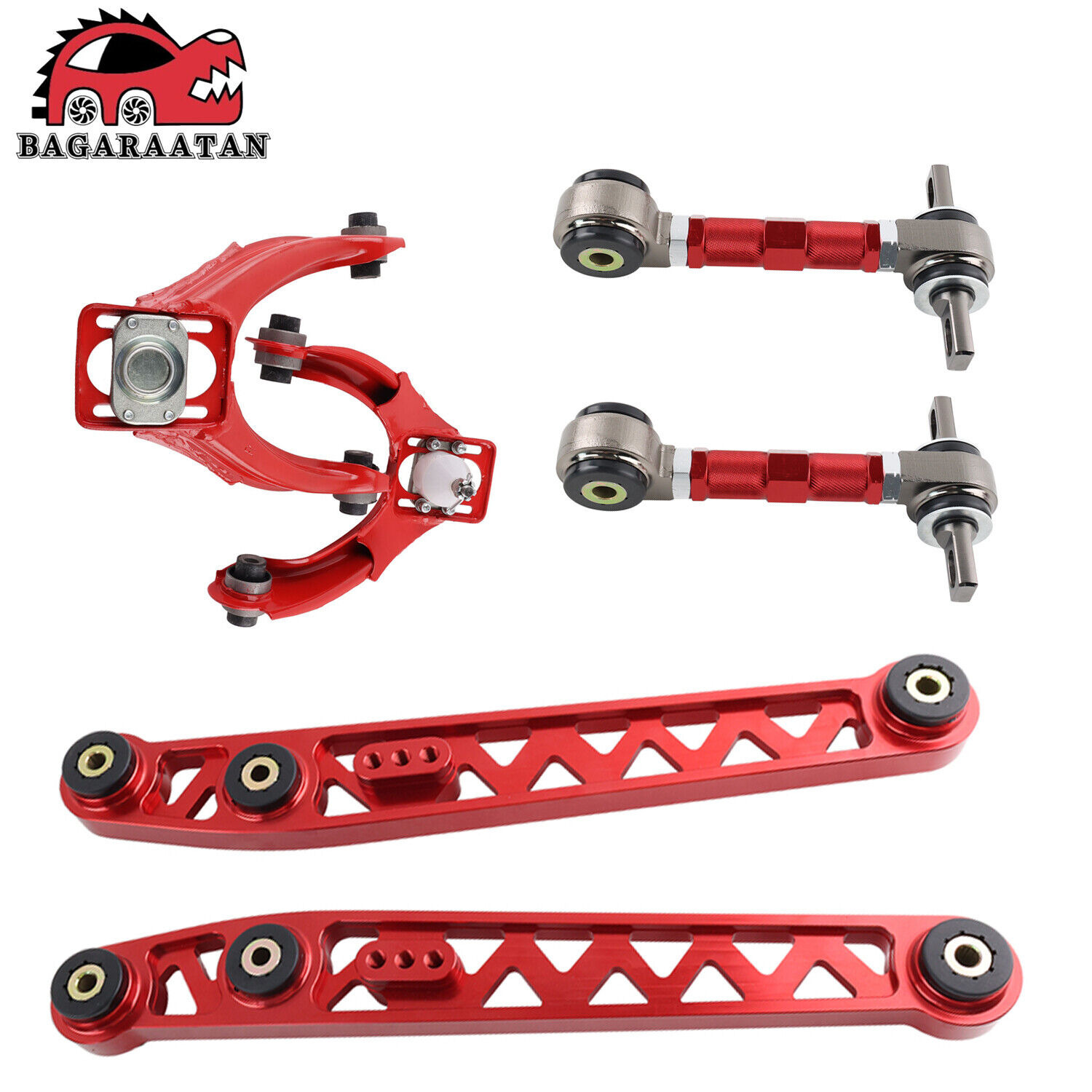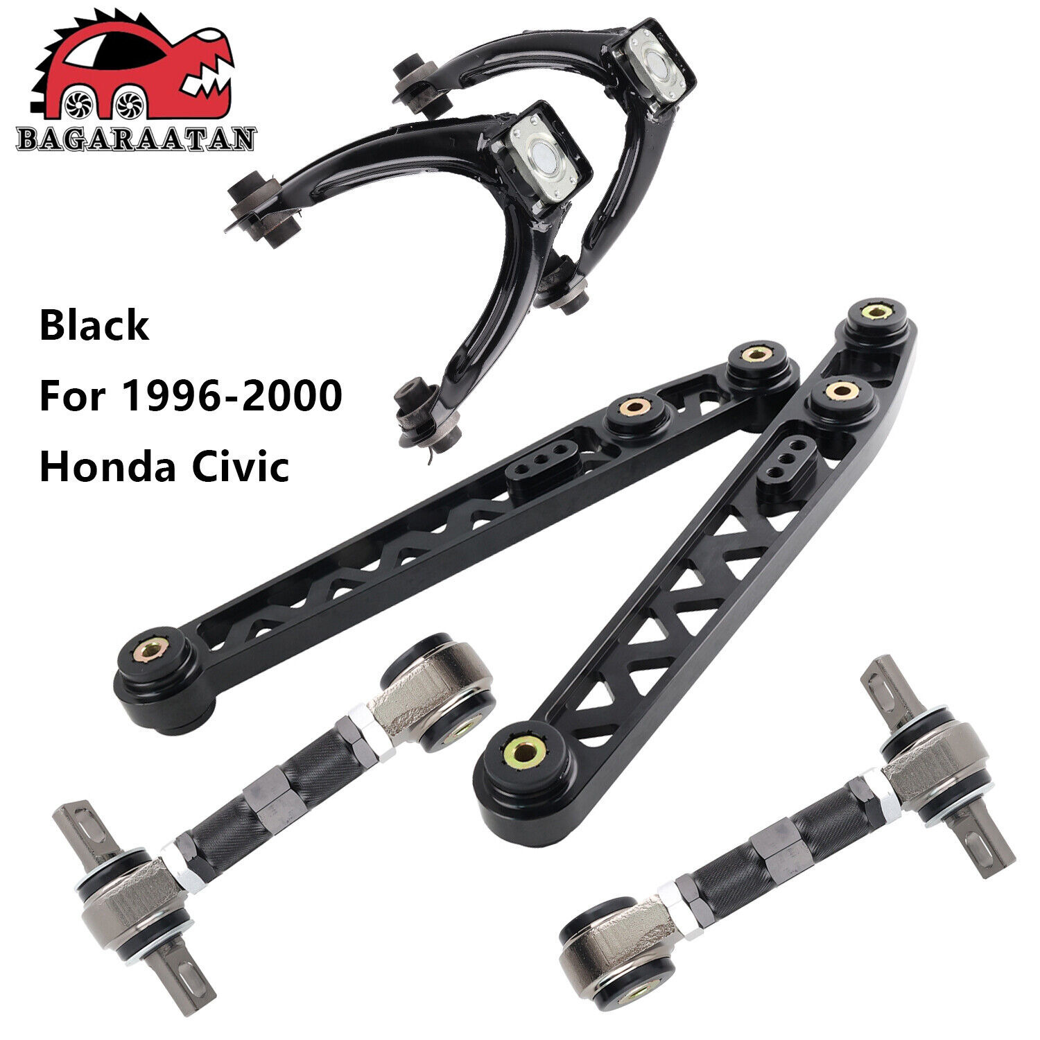 • Package includes: 1 pair rear lower control arms, 1 pair front upper control arms and a 1 pair rear camber adjustable kit. This comprehensive upgrade is essential for optimizing your Civic’s handling and maximizing tire longevity.