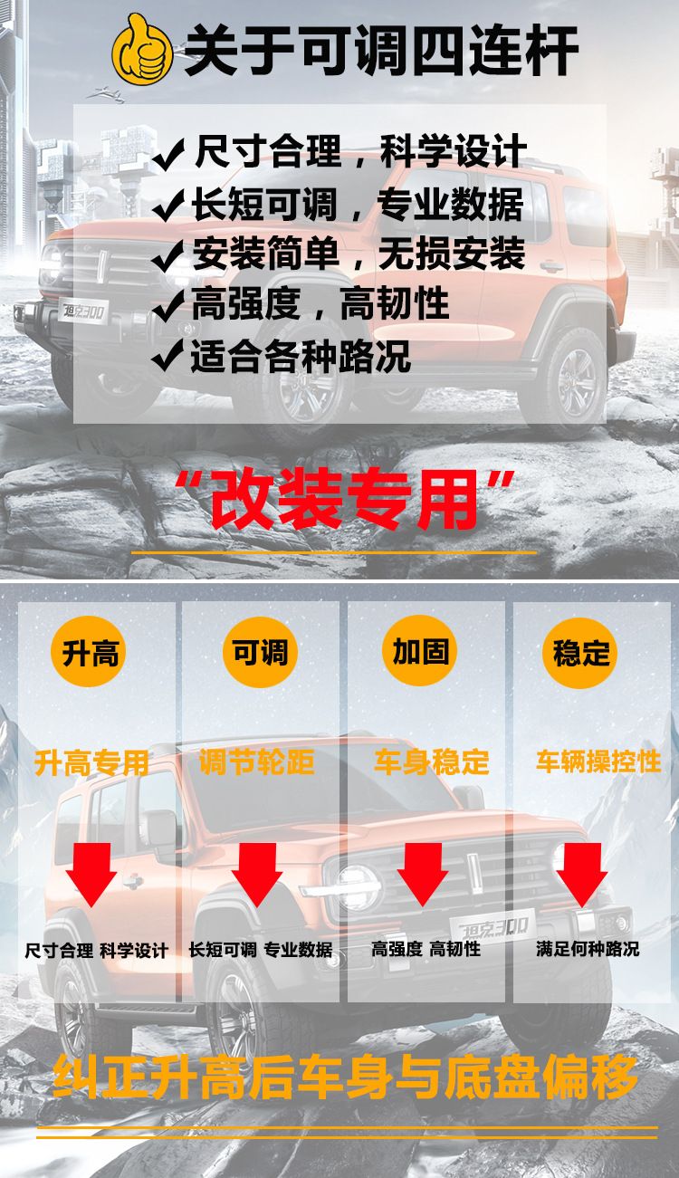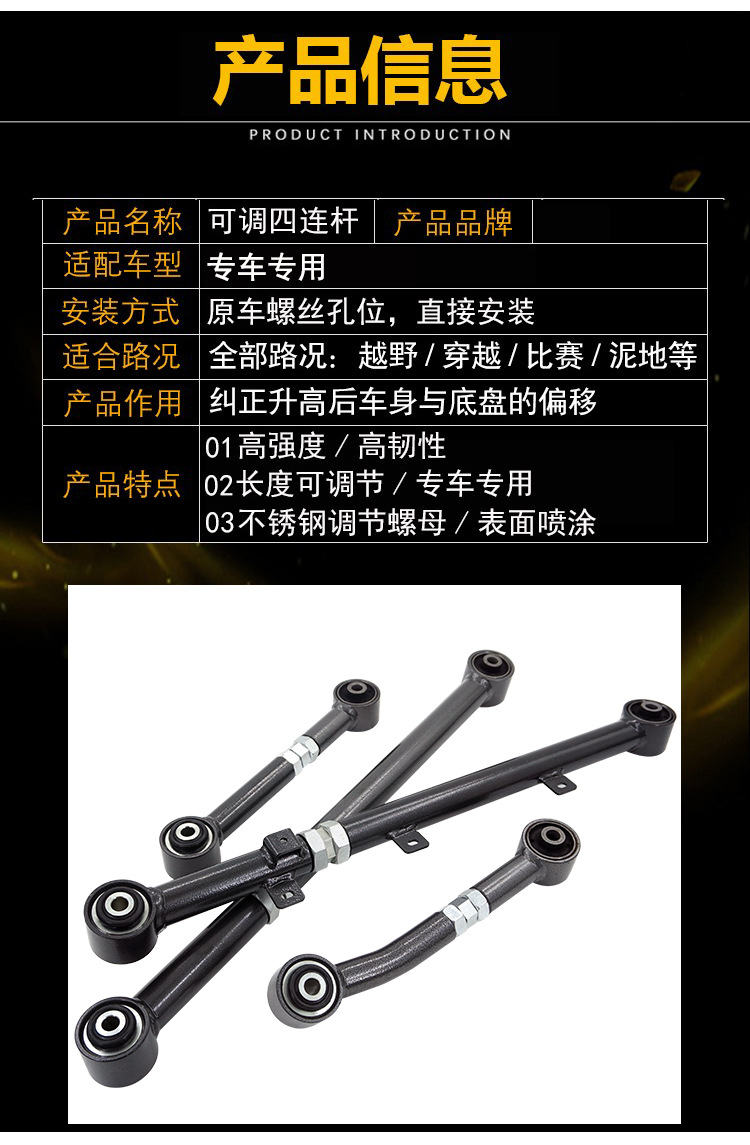 - Performance-Driven Design: Features high-quality rubber bushings and adjustable length design, as shown, to enhance off-road performance and improve handling precision after modification.