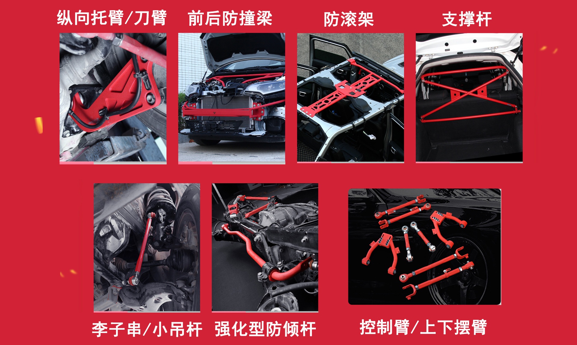 - Multiple Strengthening Bar Options: Available as engine bay anti-roll bar/front strut bar, front lower well frame, rear lower well frame, rear lower left/right hanging arms, rear lower bar, rear lower control arm (1 pair), rear lower wishbone (1 pair), aluminum-magnesium alloy wishbone (1 pair), front drop links (1 pair), front anti-roll bar, and rear anti-roll bar, allowing for a customized setup.