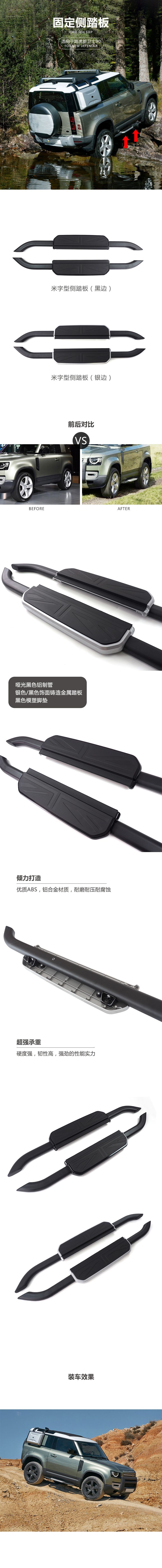 - Enhanced Vehicle Aesthetics: Featuring a sleek design and available in stylish finishes like silver or black edge Union Jack patterns, these side steps significantly upgrade your Defender’s exterior, adding both utility and a touch of elegance.