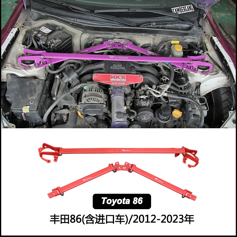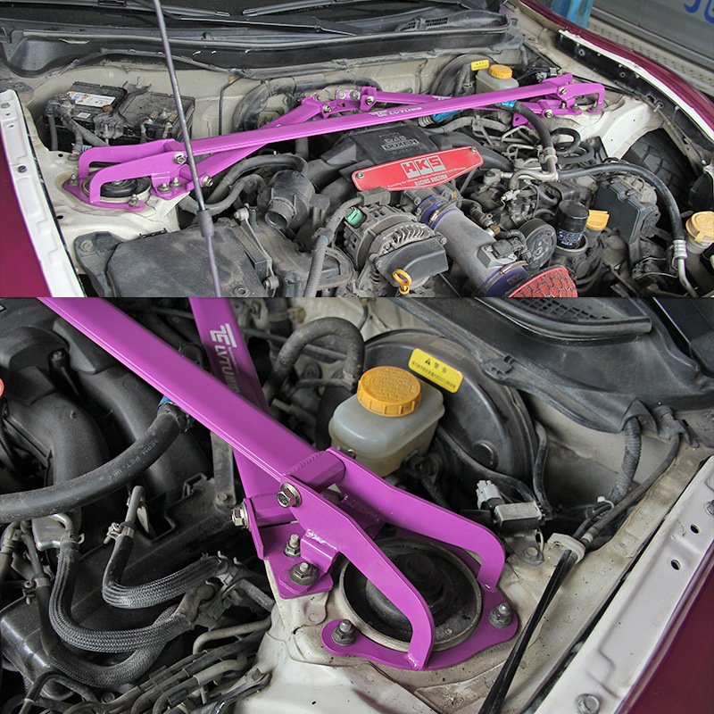 - Package Includes: One aluminum front strut bar with all necessary mounting hardware. Enhances both the aesthetic appeal and performance capabilities of your Toyota 86.