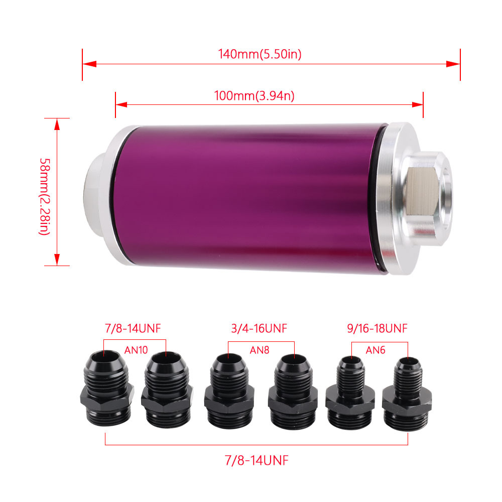 Aluminum Inline Fuel Filter (100 Micron, 58mm) for Universal Fuel Systems with AN6, AN8, AN10 Adapter Fittings