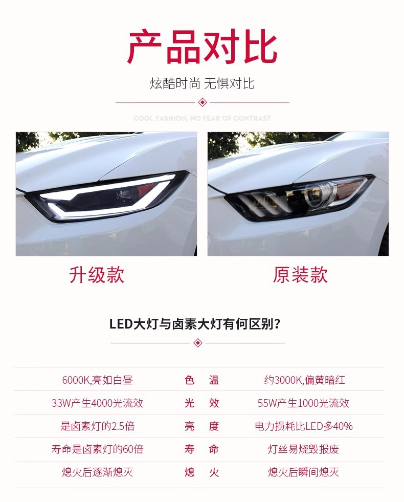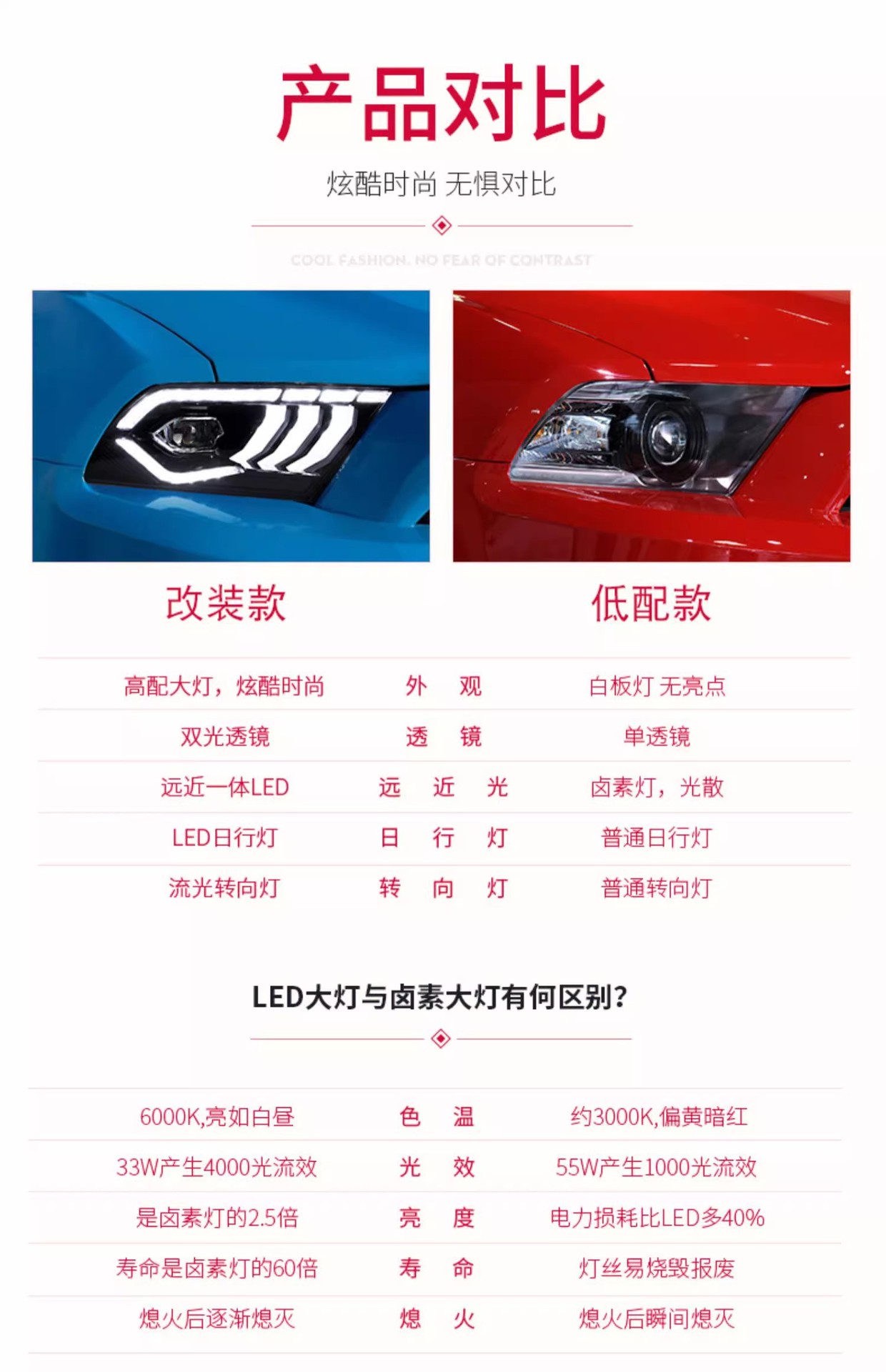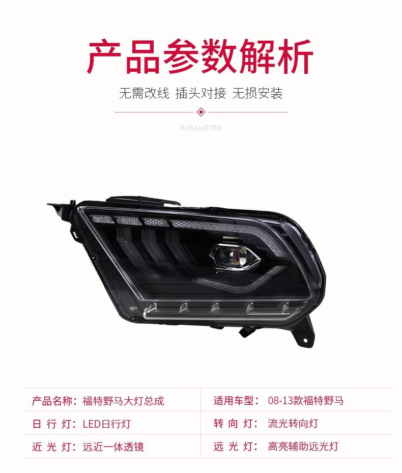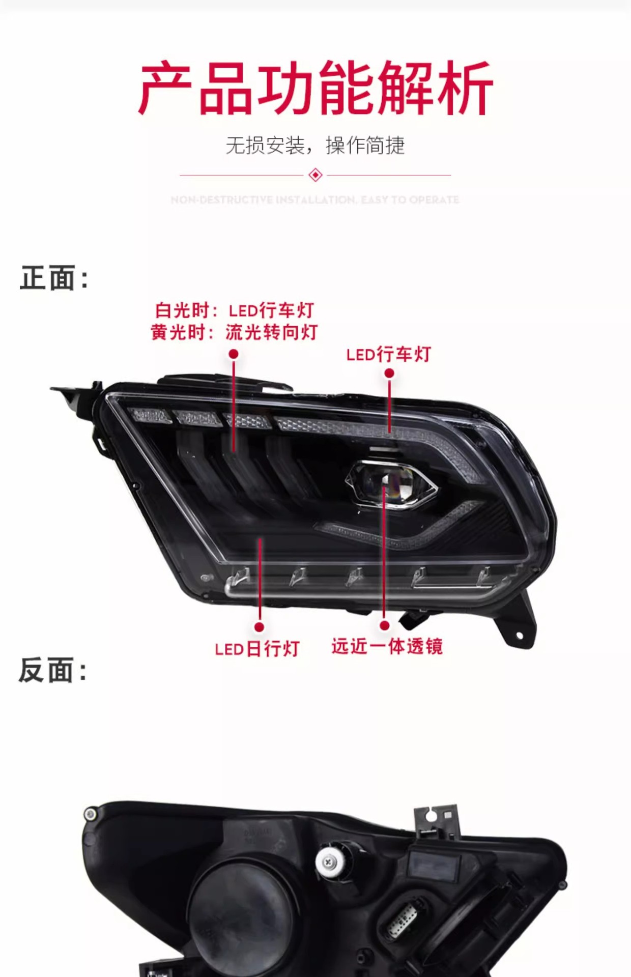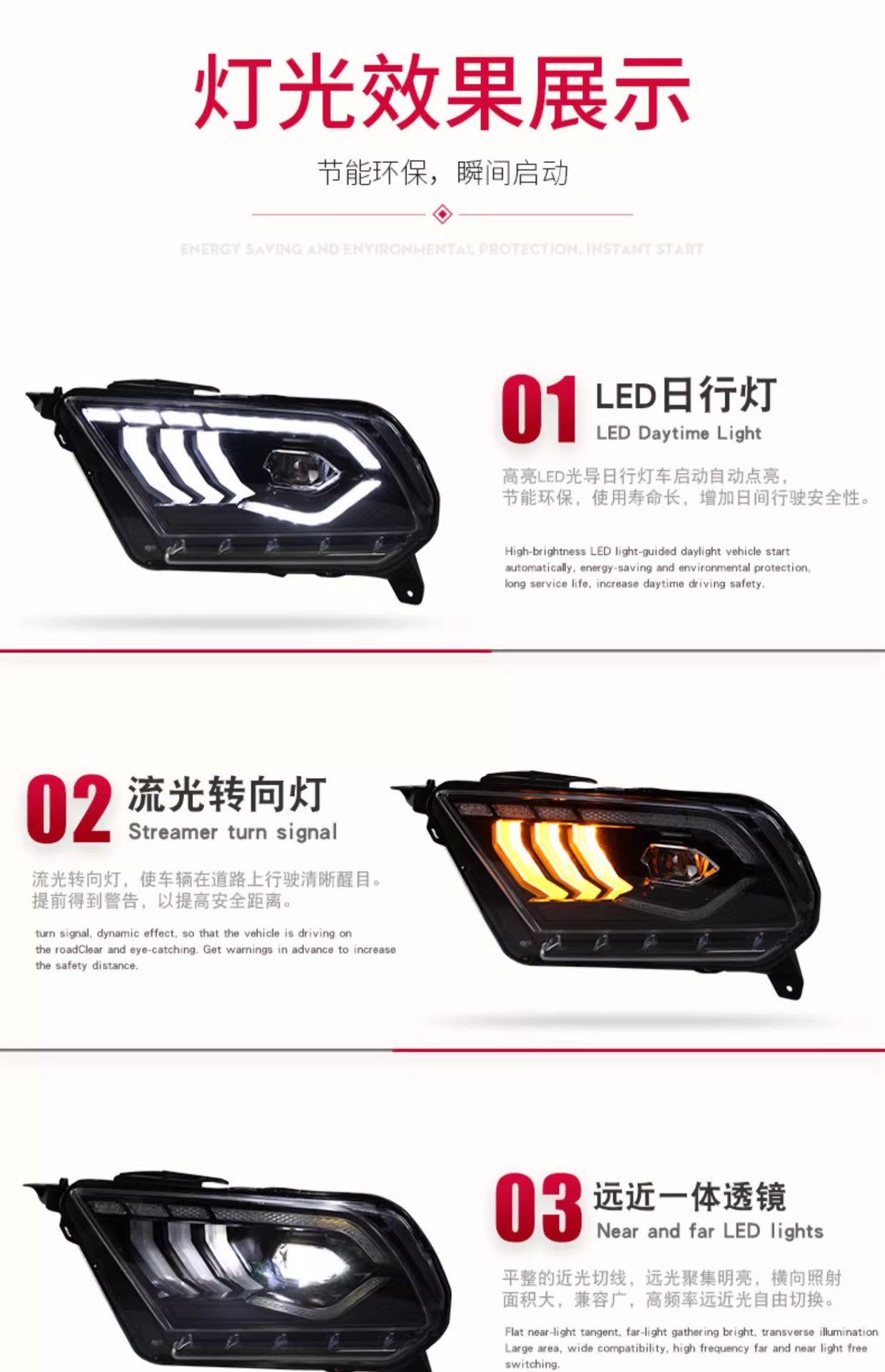 - Enhanced Styling: Features modern LED daytime running lights (DRL) and dynamic sequential turn signals, giving your Mustang a distinctive, upgraded, and eye-catching appearance on the road.