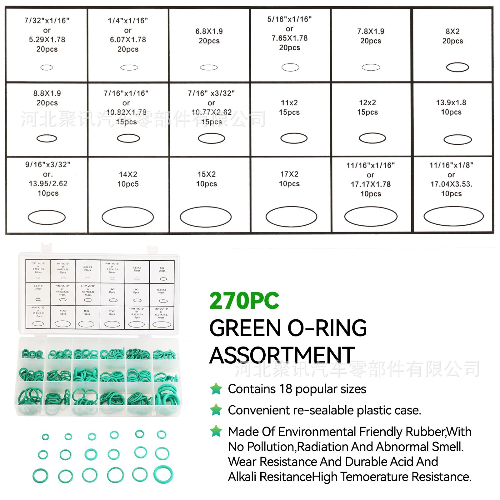 - Comprehensive Assortment: Includes a wide range of O-ring sizes, as detailed in the image (e.g., 7/32″ x 1/16″, 1/4″ x 1/16″, 6.8 x 1.9mm, up to 11/16″ x 1/8″), available in 225PCS or 270PCS sets to meet diverse repair needs. Each kit comes organized in a clear, multi-gridded storage box.