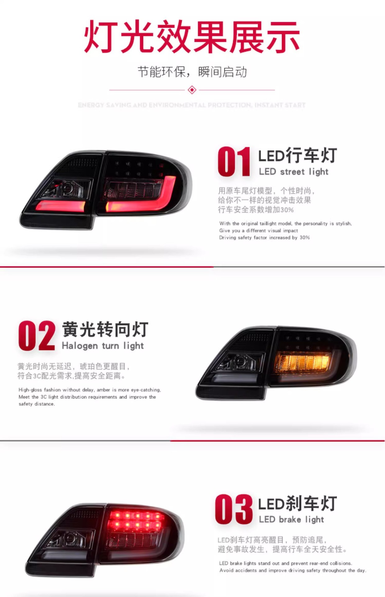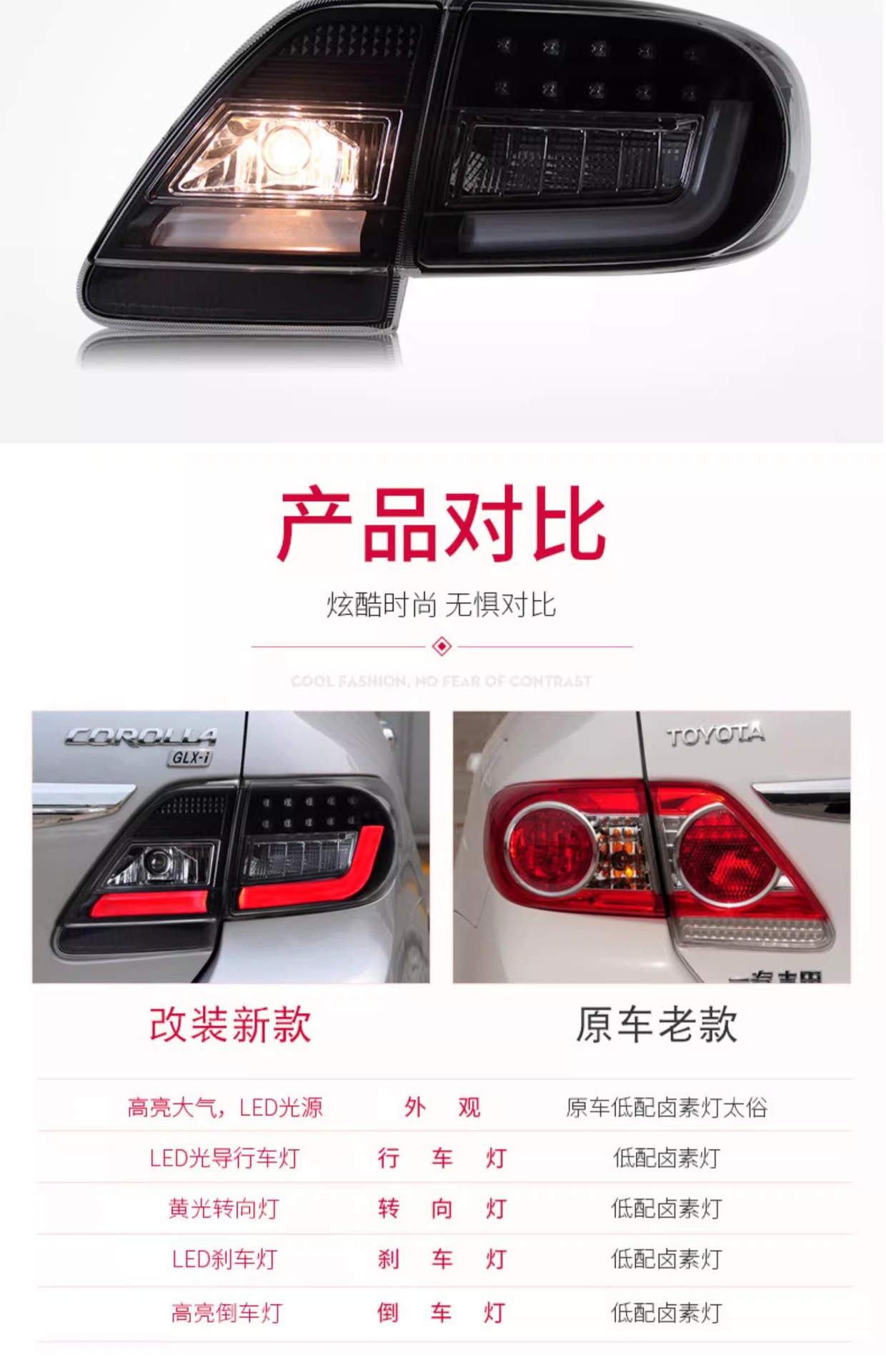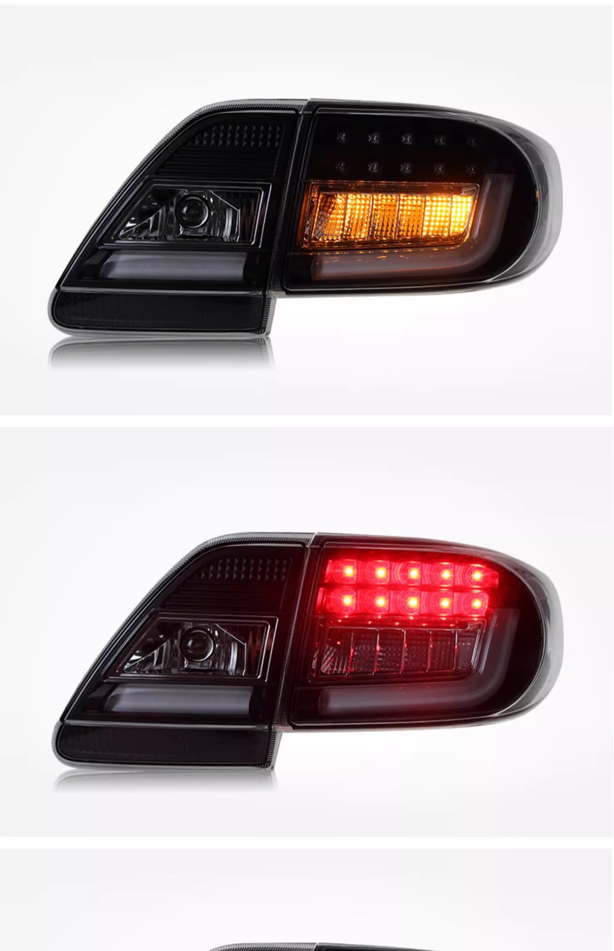 - Enhanced Aesthetics: Features a sleek, smoked black design that provides a modern and aggressive look, upgrading your Corolla’s rear end with stylish LED daytime running lights, brake lights, and turn signals.