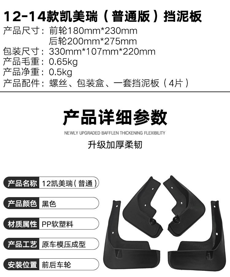 - Durable PP Soft Plastic: Constructed from high-quality PP soft plastic, these mud flaps offer excellent flexibility, impact resistance, and durability against harsh road conditions and debris.