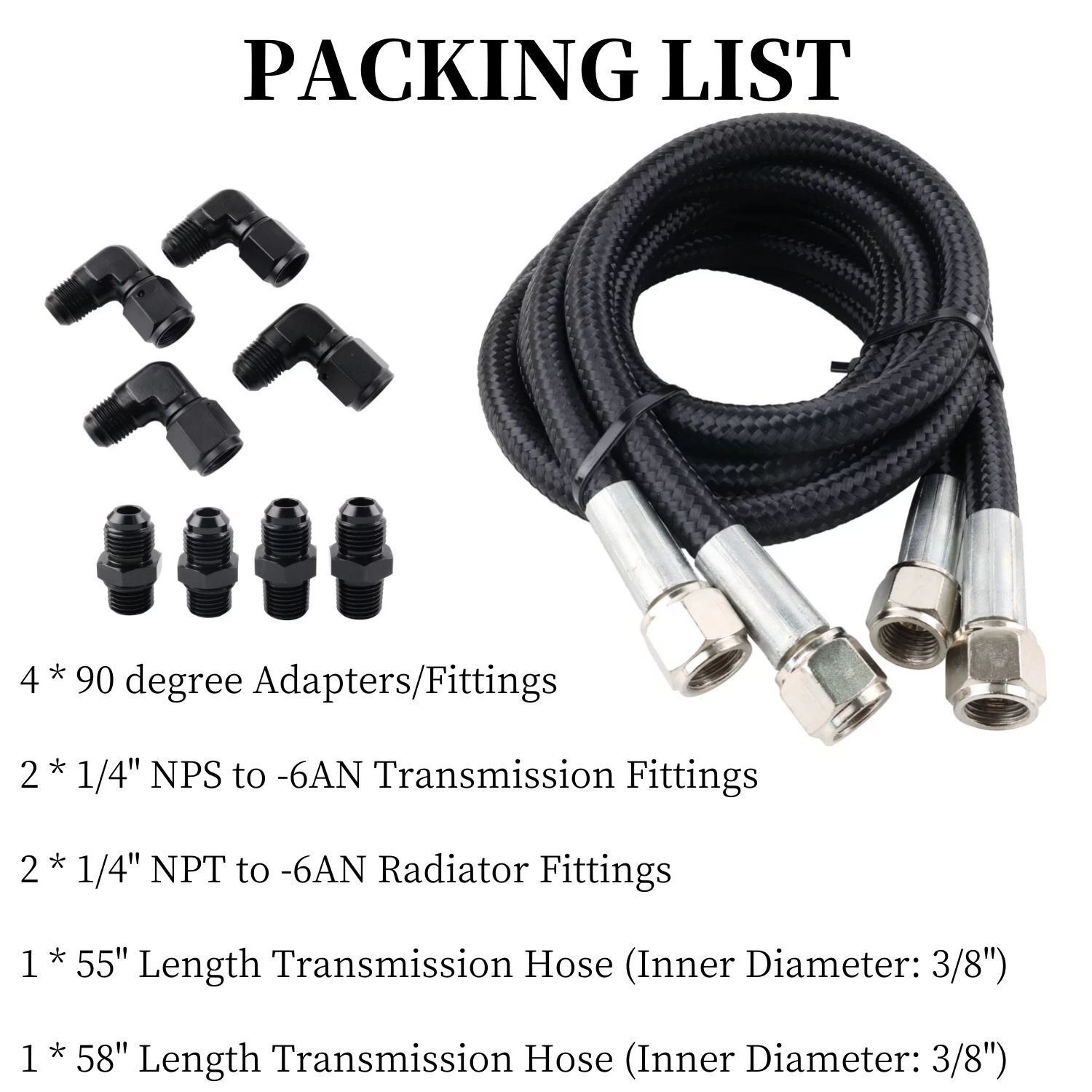• This comprehensive kit includes a 15′ black braided AN6 hose, straight and 90-degree AN6 hose ends, and black 1/4″ NPSM and NPT fittings for transmission and radiator connections, providing a complete solution for upgrading your transmission cooling system.