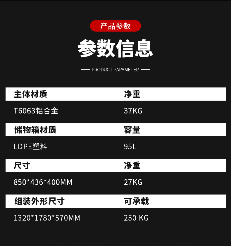 - Integrated Storage Solution: Comes with two 95L capacity side storage boxes, offering ample space to keep your tools and gear organized and secure during transit.