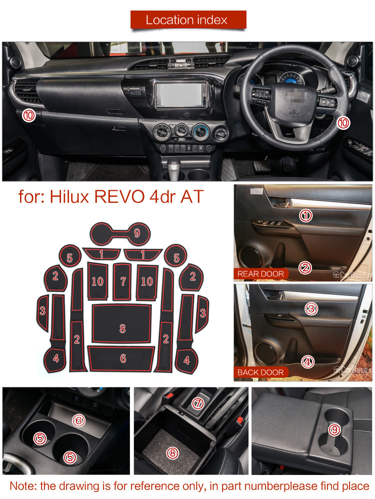 - Direct Fitment: A perfect replacement for Toyota Hilux interior. Compatible with Hilux door slots, cup holders, and console box.