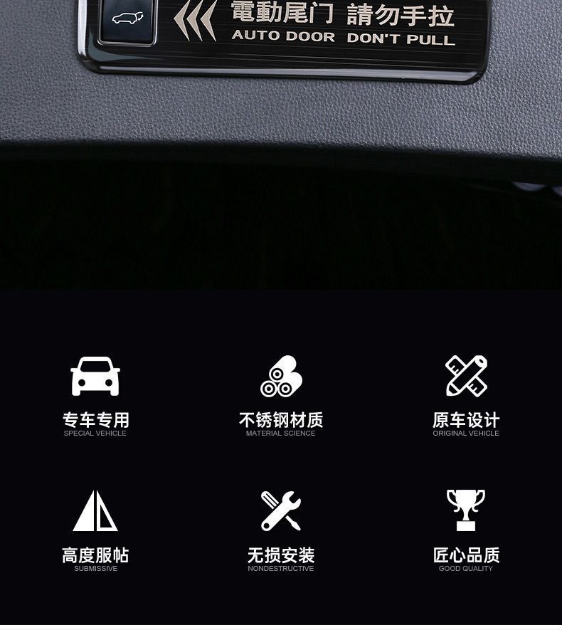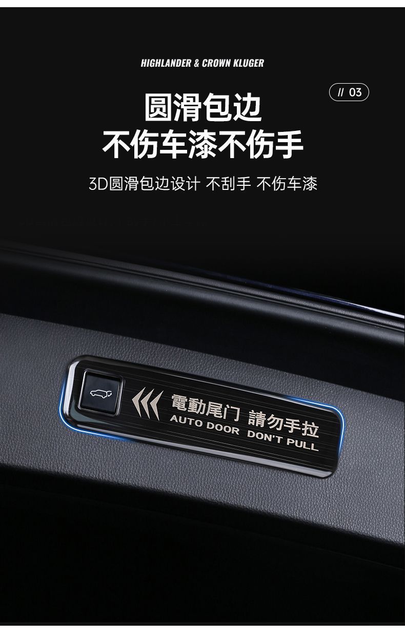 - Performance-Driven Design: Features clear “AUTO DOOR DON’T PULL” text in English and Chinese, visually reminding users of the electric tailgate function to prevent manual damage.