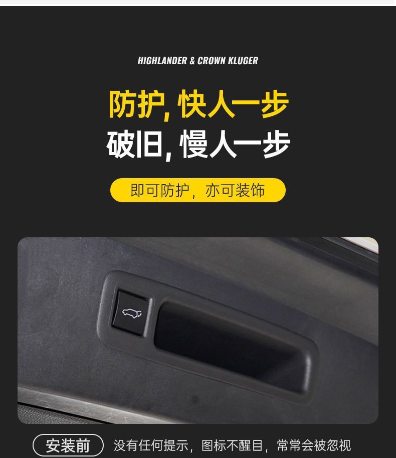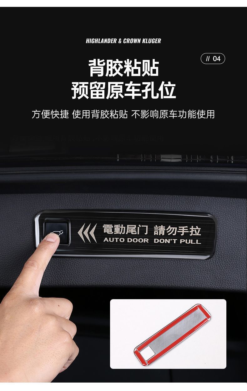 - Direct Fitment: A perfect replacement for models like Toyota Highlander, Crown Kluger, Sienna, and Granvia. Enhances the look around the power tailgate button.