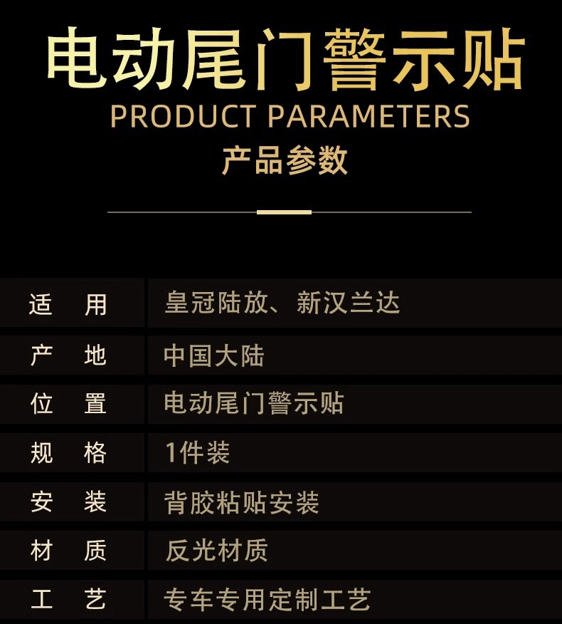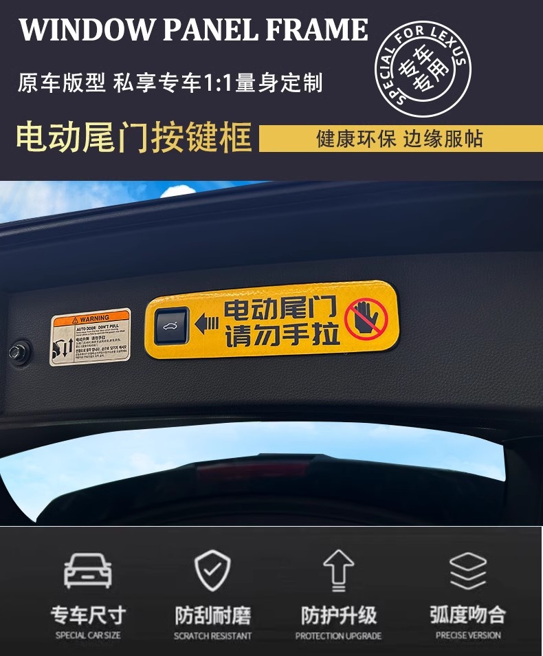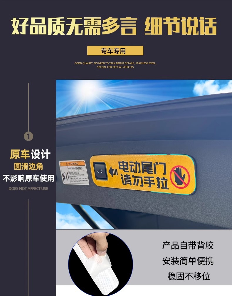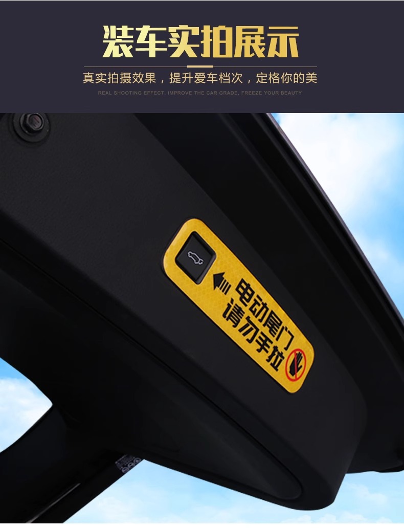 - Durable Construction: Crafted from high-quality material with a clear warning message “电动尾门, 请勿手拉” (Electric tailgate, Do not pull by hand) to ensure durability and visibility.