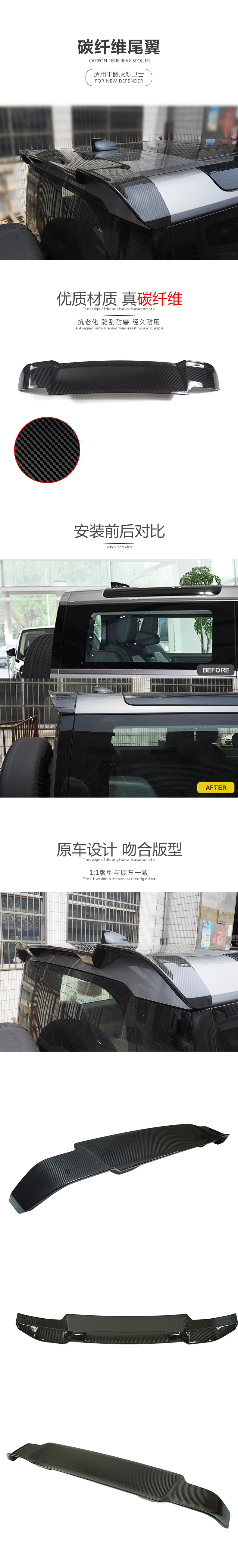 - Aggressive Styling Upgrade: Featuring a sleek carbon fiber finish, this wing dramatically elevates your Defender’s sporty and aggressive appearance, making it stand out on the road.