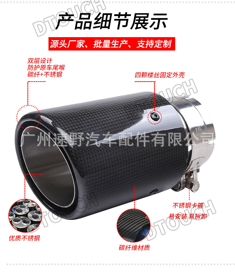 • Sporty Design with Red Accents: Featuring a curled design with a striking red finish and carbon fiber texture, this exhaust tip adds a race-inspired, luxurious aesthetic to your vehicle’s exterior, enhancing its visual appeal and creating a custom look.