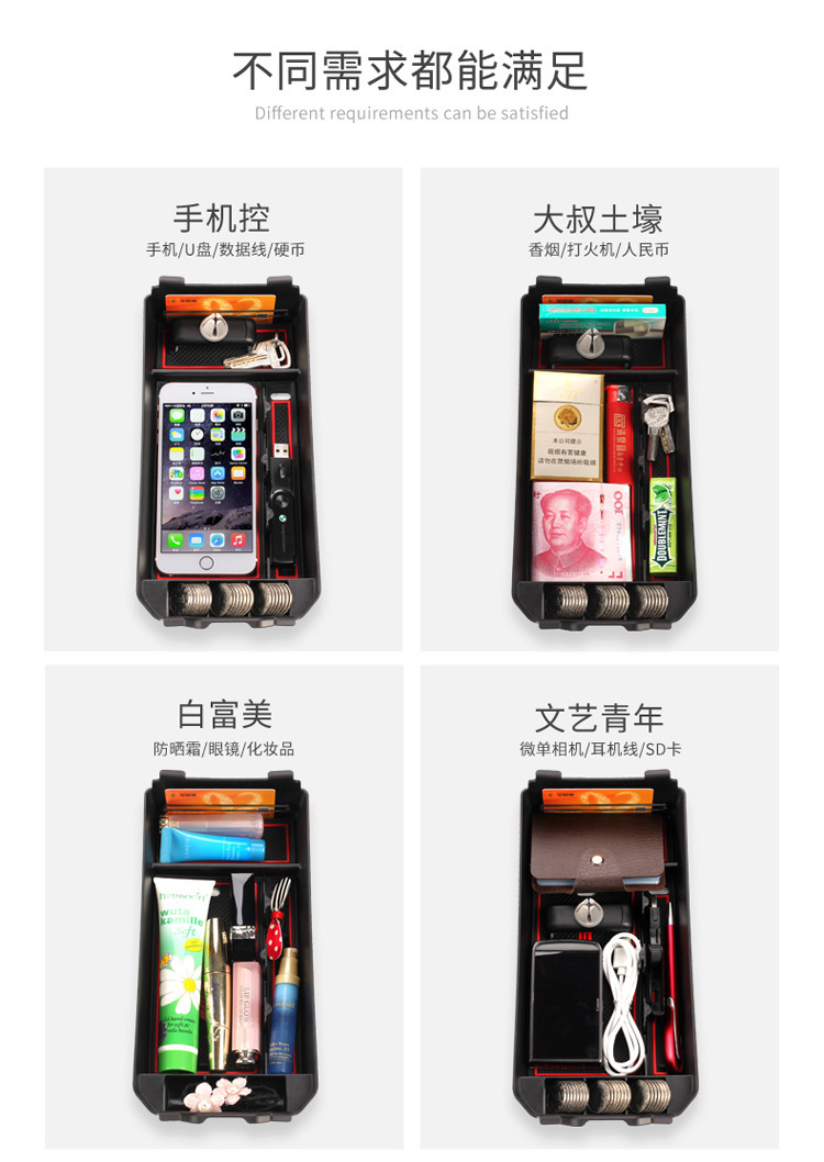 - Performance-Driven Design: Features multiple compartments, as shown, to organize small items like coins, keys, and phones, keeping your armrest tidy.