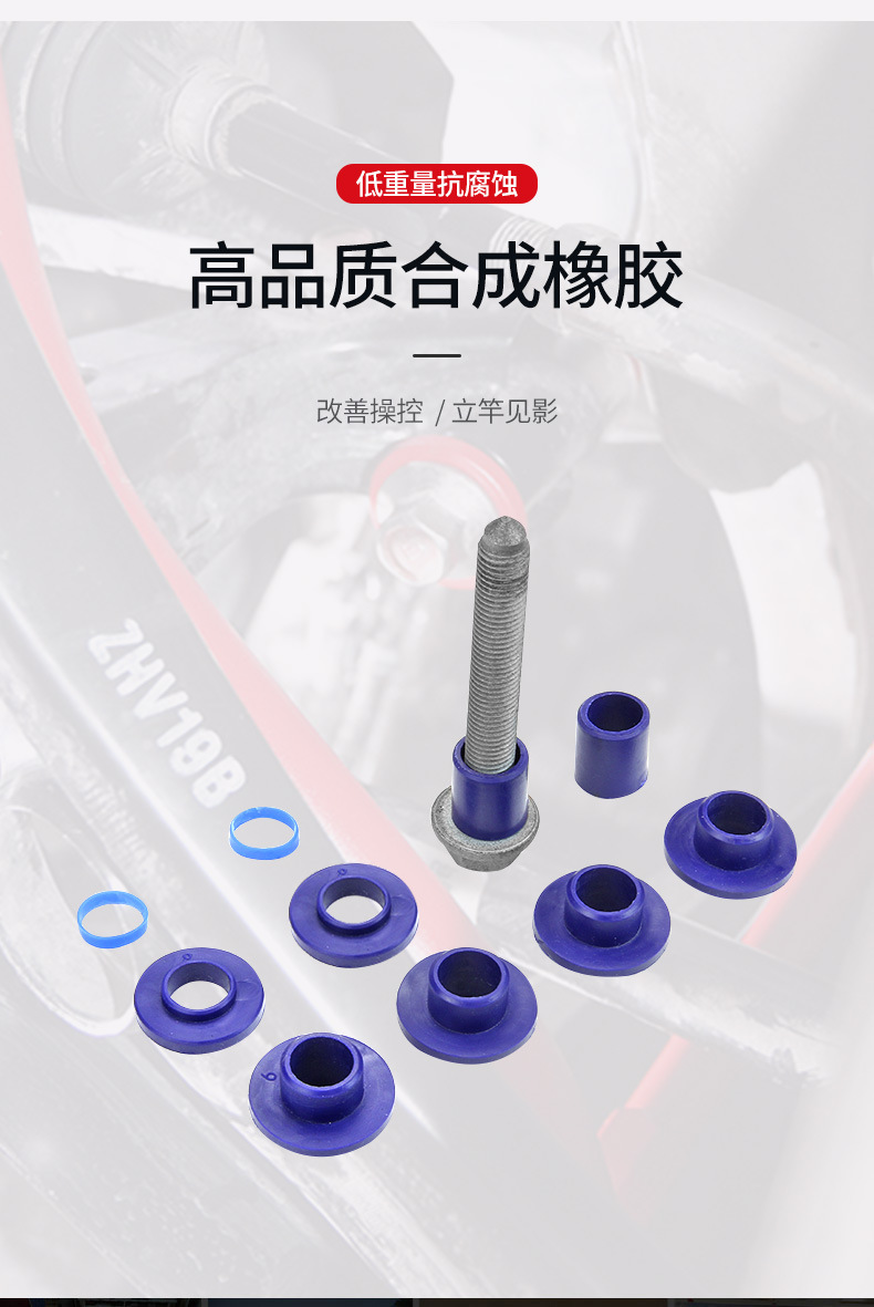 - Complete Bushing Kit: This package includes a complete set of reinforced chassis bushings, providing a comprehensive solution for upgrading your vehicle’s undercarriage. Improve overall vehicle rigidity and achieve a more stable, planted feel on the road.