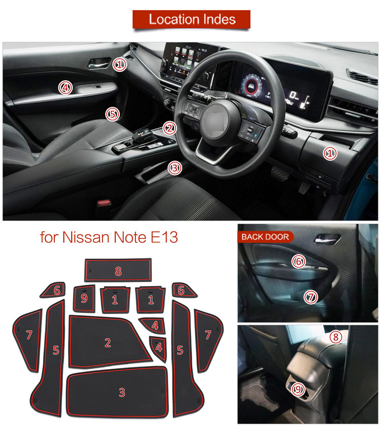 - Complete Package: Includes a full set of custom-designed mats and inserts, exactly as pictured, to cover all relevant interior slots in your Nissan Note E13. Please verify fitment details before purchasing.