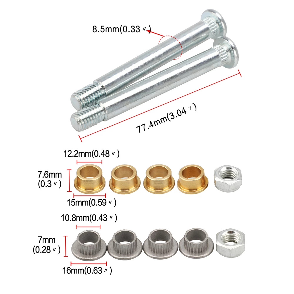 • Each package contains the necessary components to repair one door, including 2 steel door hinge pins, 8 bushings, and 2 lock nuts, providing a complete solution to restore proper door function and enhance your vehicle’s longevity.