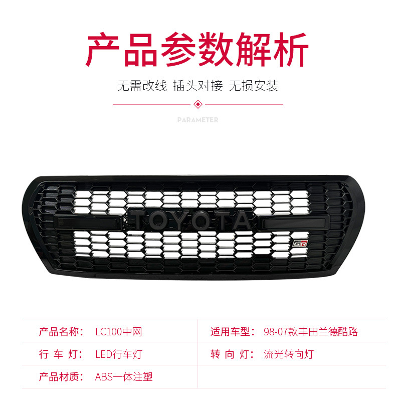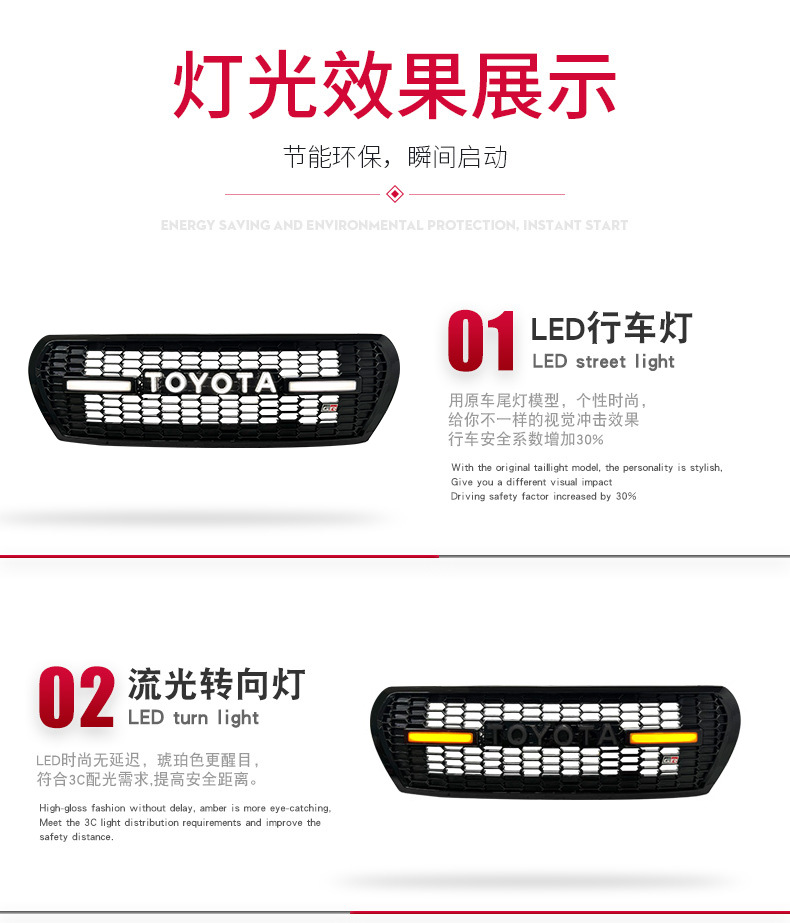 - Heavy-Duty Build: Crafted from high-strength ABS plastic with a black honeycomb design, featuring a prominent “TOYOTA” logo and integrated LED light bar for a unique look and enhanced visibility.