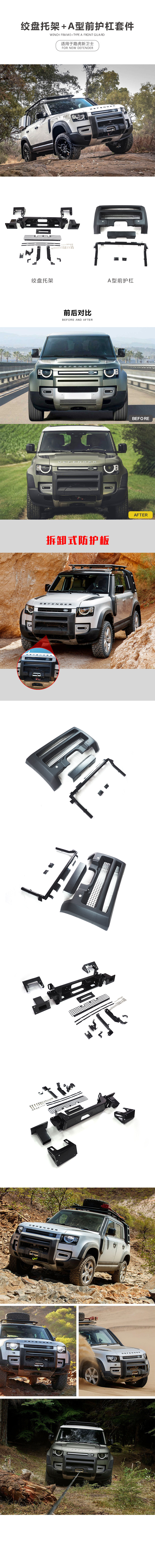 - Enhanced Vehicle Aesthetics: Upgrade your Defender’s appearance with a robust and stylish front bumper guard, available in a winch tray kit or A-type bumper bar design.