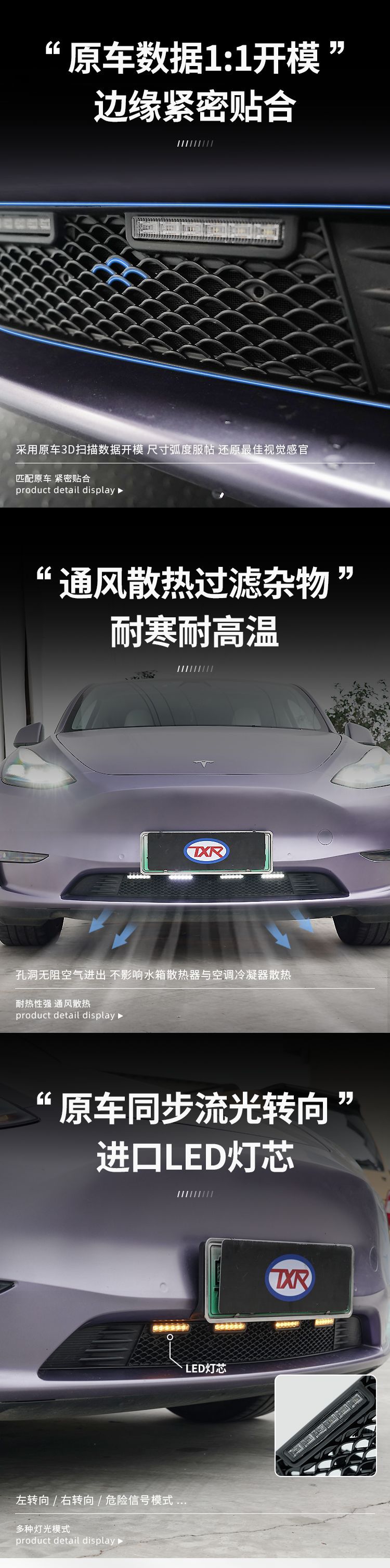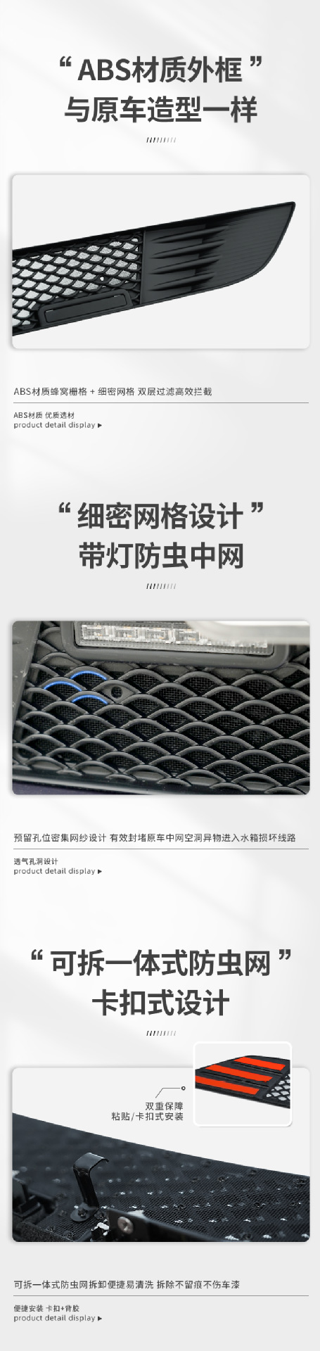 - Performance-Driven Design: Features integrated LED lights across the lower grille, enhancing visibility and aesthetic appeal while effectively blocking foreign objects and being easy to clean.