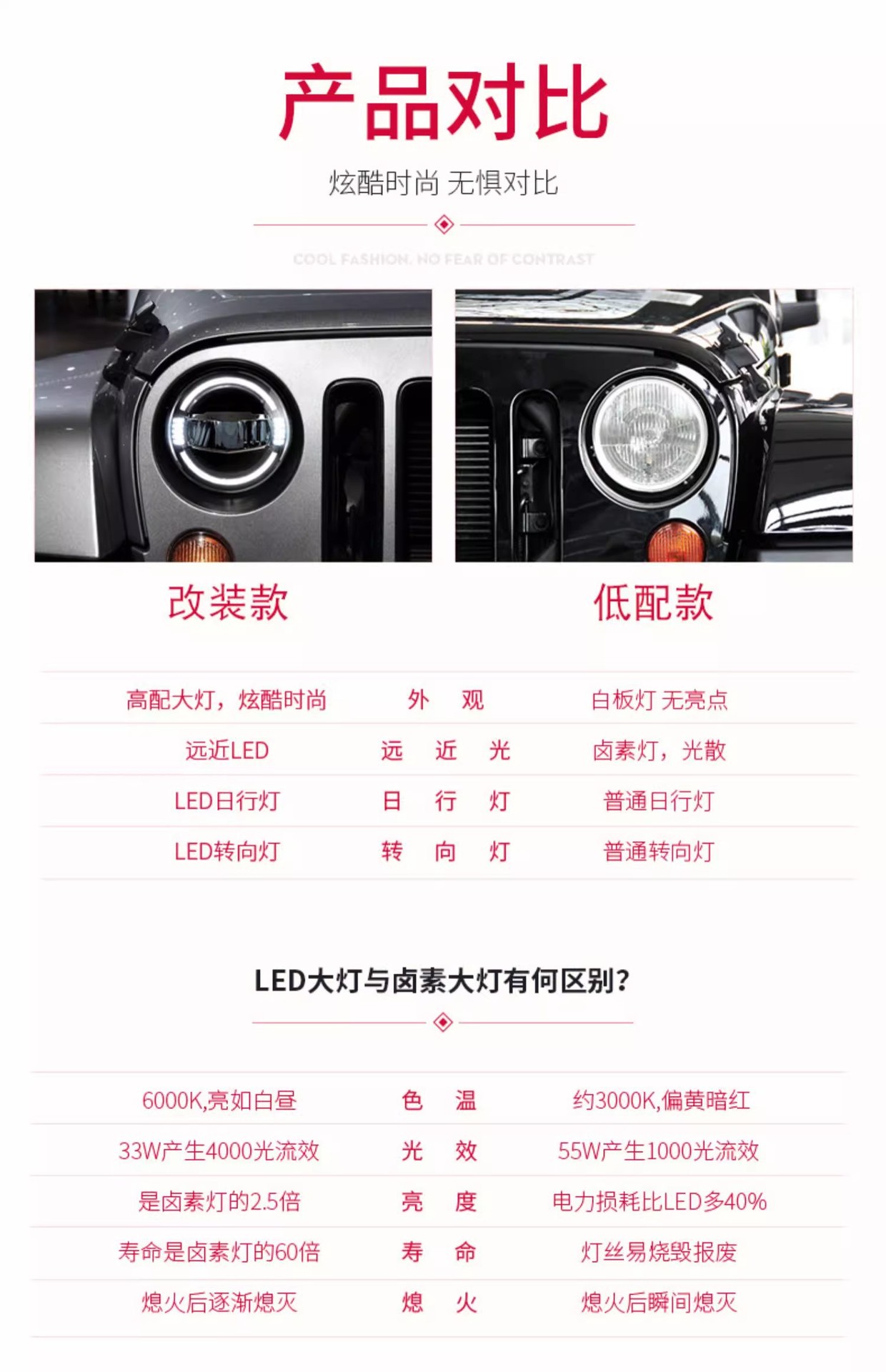 - Enhanced Styling: Upgrade your Wrangler’s look with modern light guide daytime running lights and integrated turn signals for a distinctive appearance.