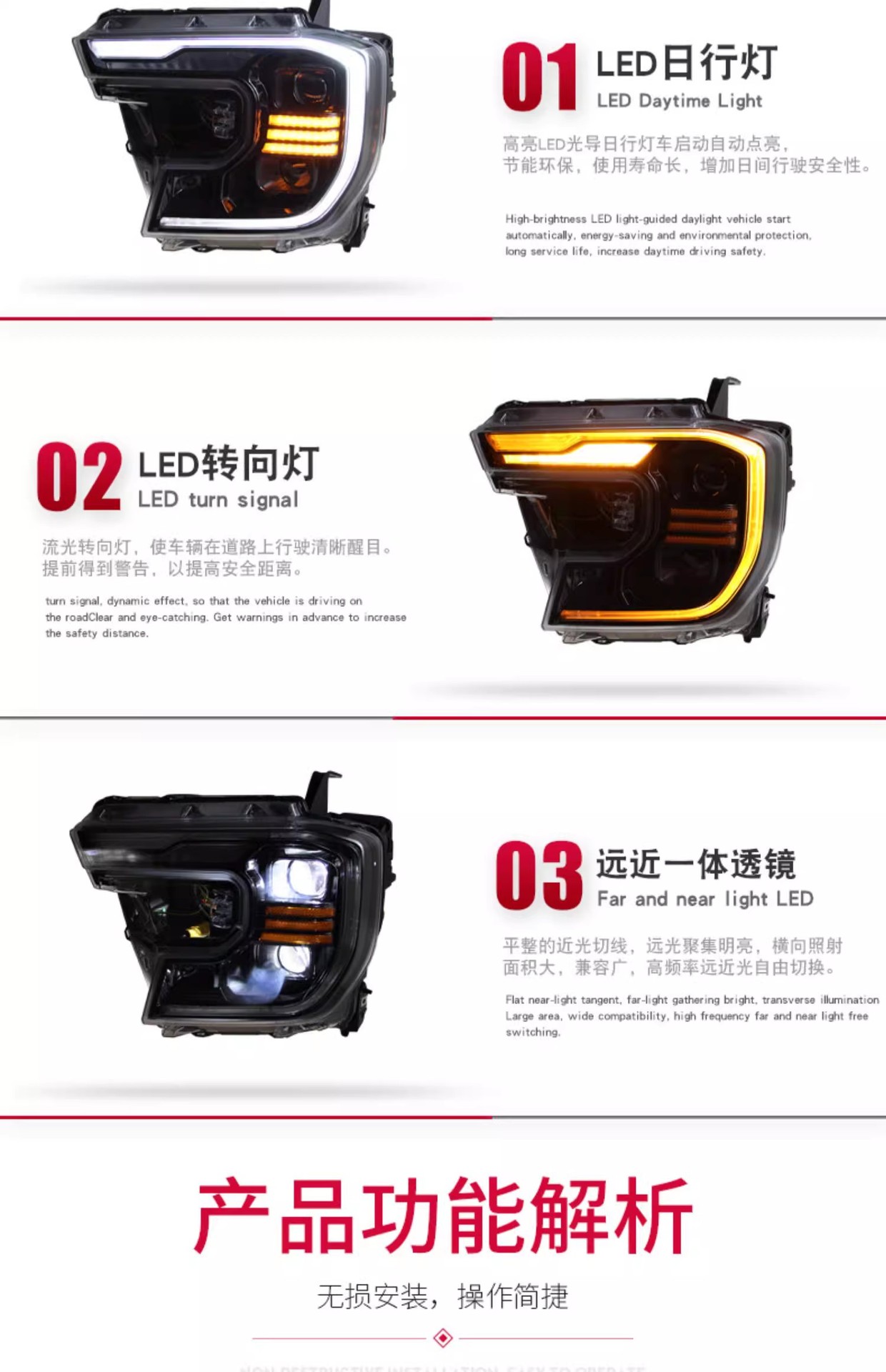 - Enhanced Styling: Features a sleek full LED design with integrated LED daytime running lights (DRL) and signal lights, dramatically enhancing your vehicle’s modern aesthetic and visibility.