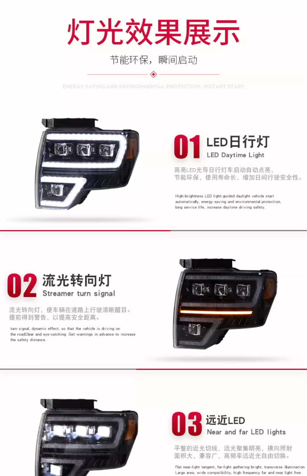 Full LED Headlight Assembly with DRL Sequential Turn Signal Projector Lens for Ford F-150 Raptor 2008-2014