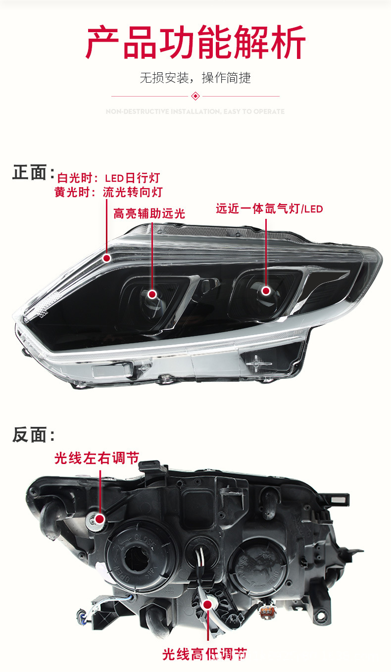 - Dynamic Styling: Integrated LED daytime running lights (DRL) and sequential flow turn signals provide a distinctive and stylish upgrade to your vehicle’s front end.