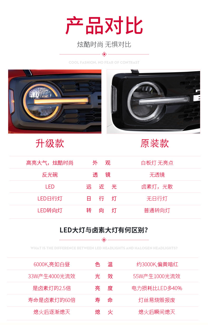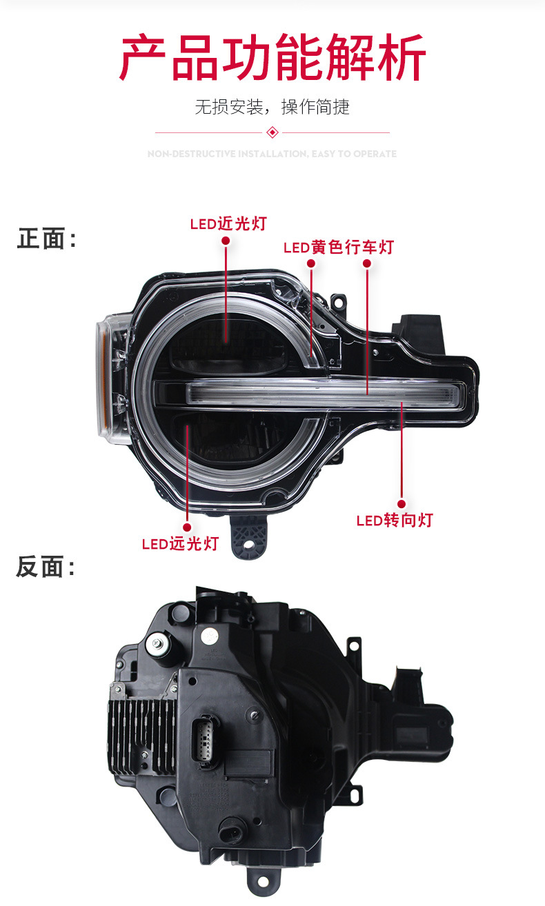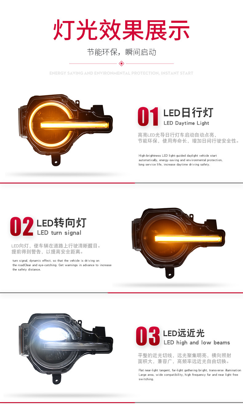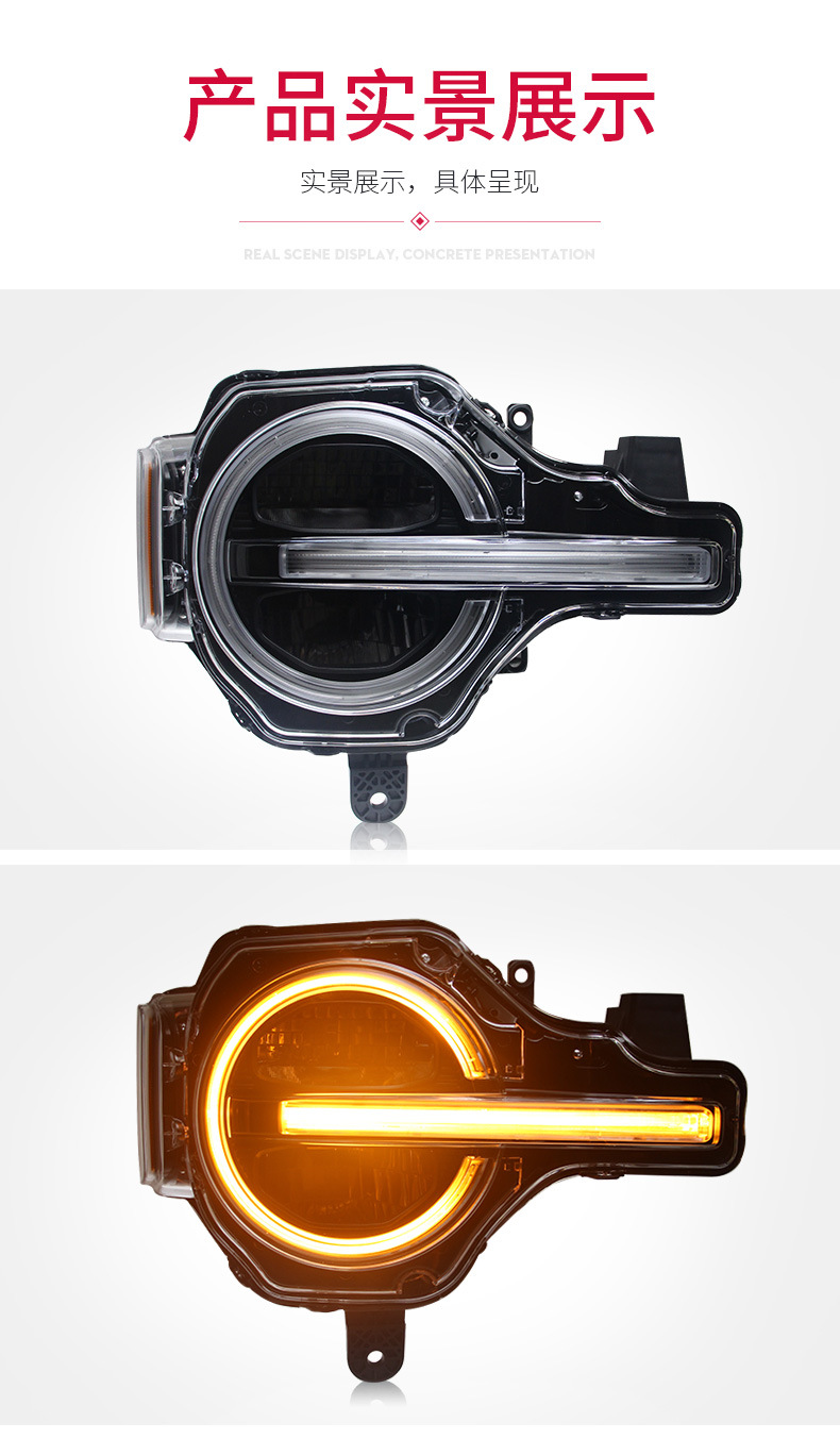 - Enhanced Styling: Features a sleek design with integrated yellow LED Daytime Running Lights (DRL) and dynamic sequential turn signals, significantly upgrading your Bronco’s appearance.