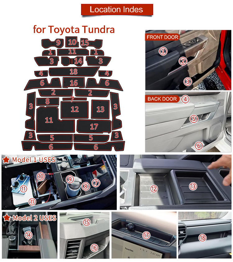 - Direct Fitment: A perfect replacement for 2022-2024 Toyota Tundra models. Designed to precisely fit door slots, center console, and cup holders.