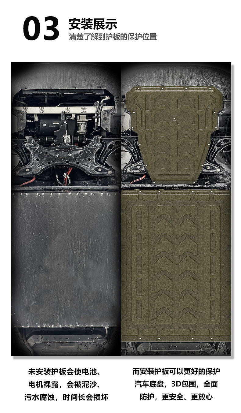 - Performance-Driven Design: Offers comprehensive protection for the vehicle’s chassis, front motor, and battery, safeguarding against road debris and external damage.