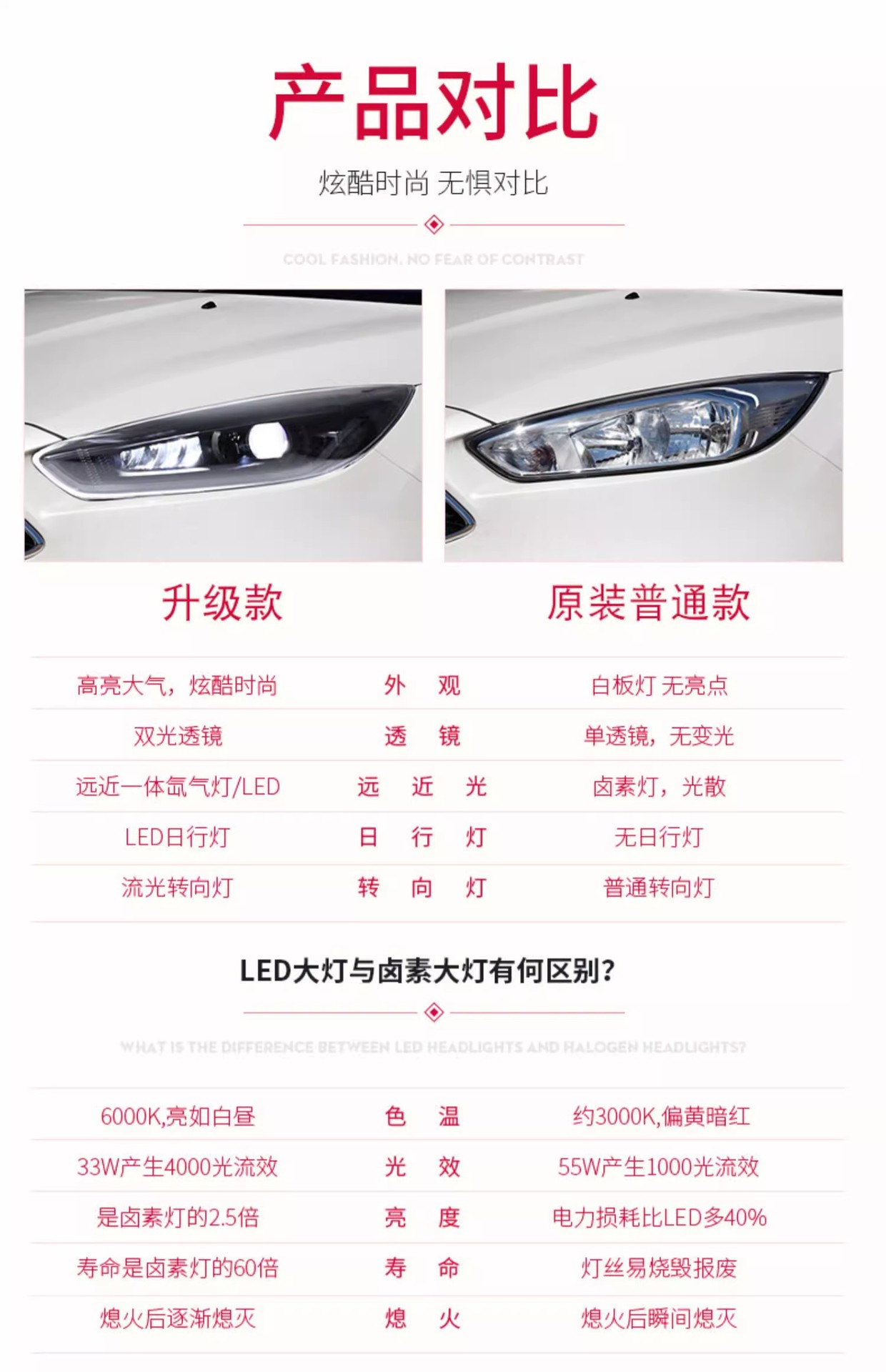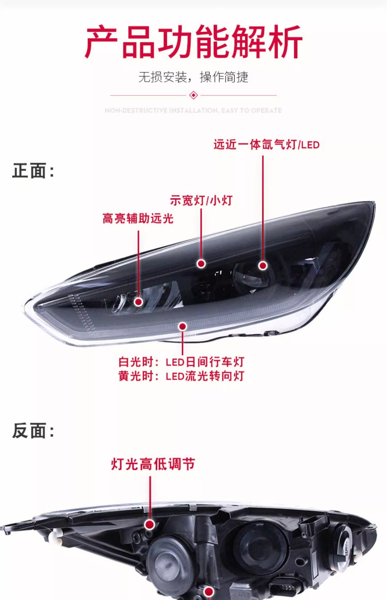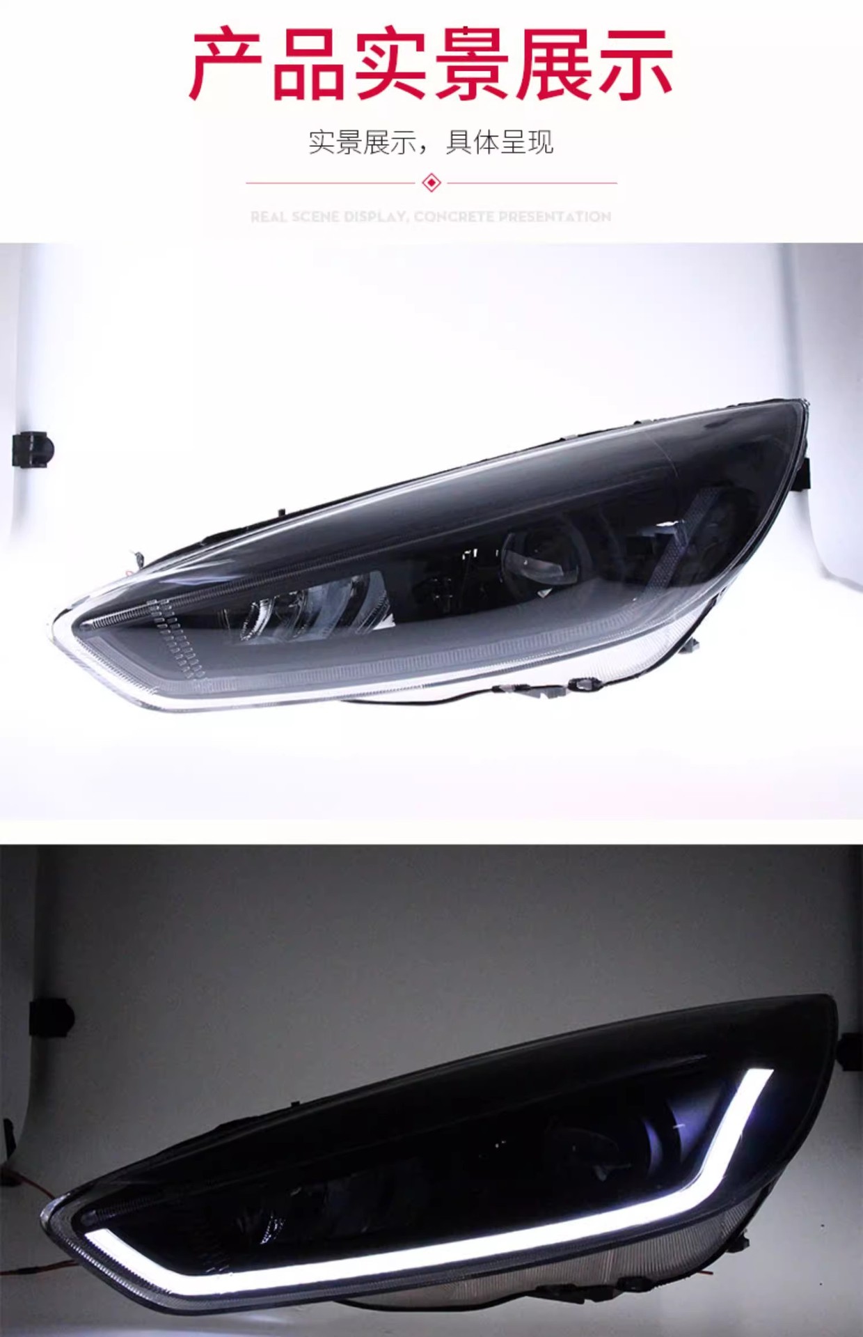 - Modern Styling: Upgrade your vehicle’s aesthetics with integrated LED Daytime Running Lights (DRL) and dynamic flowing turn signals, giving your Ford Focus a modern and distinctive look.