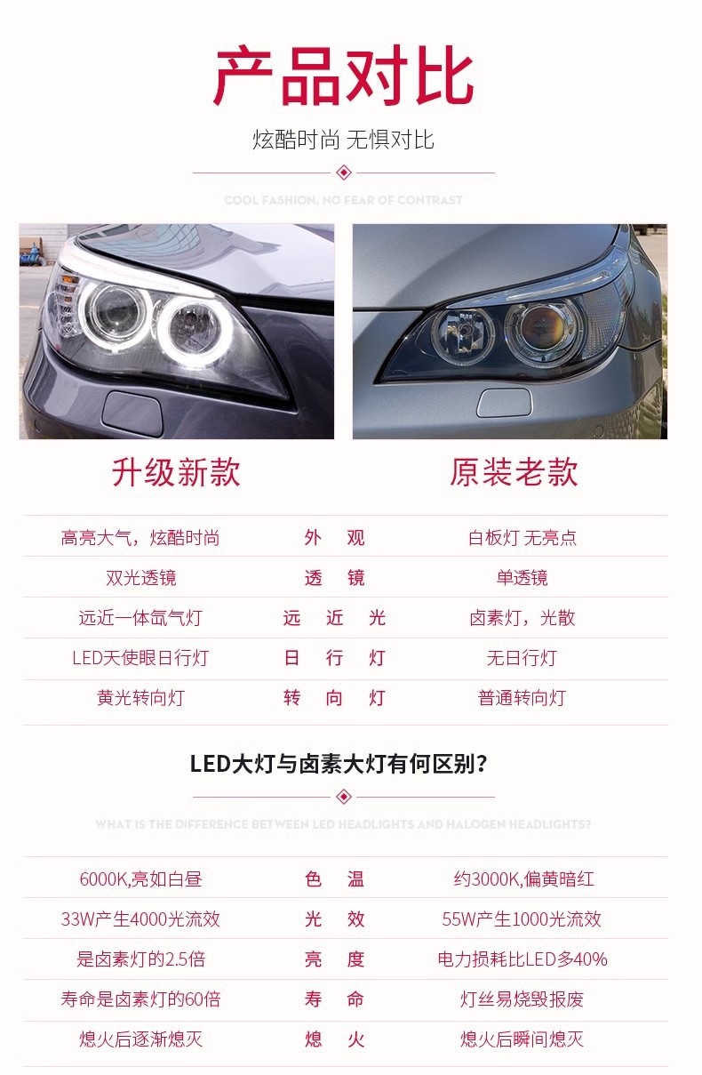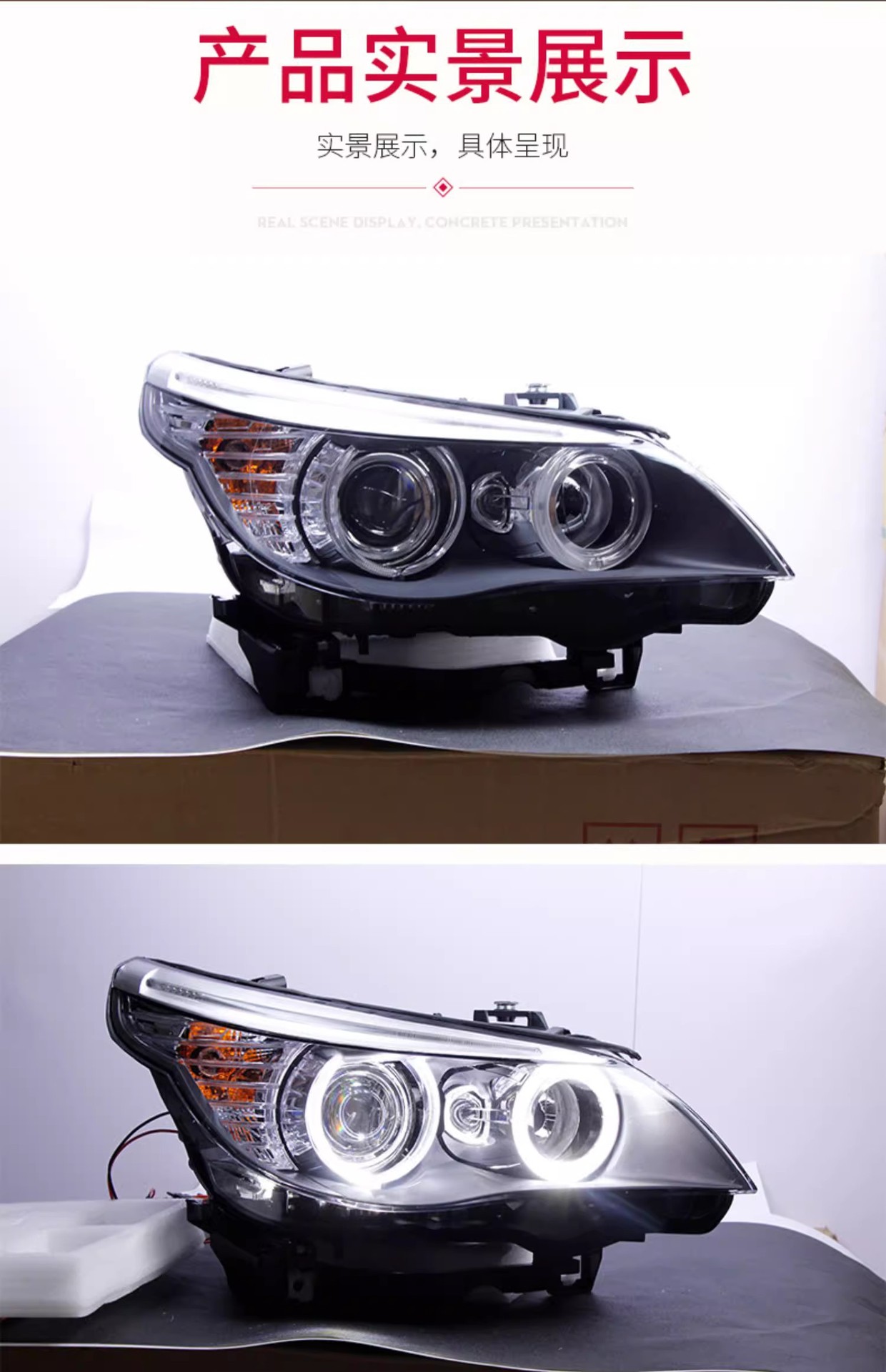 - Stylish Angel Eyes: Integrated Angel Eye accents provide a modern and distinctive look, upgrading your BMW’s front-end aesthetics with a contemporary and elegant design.