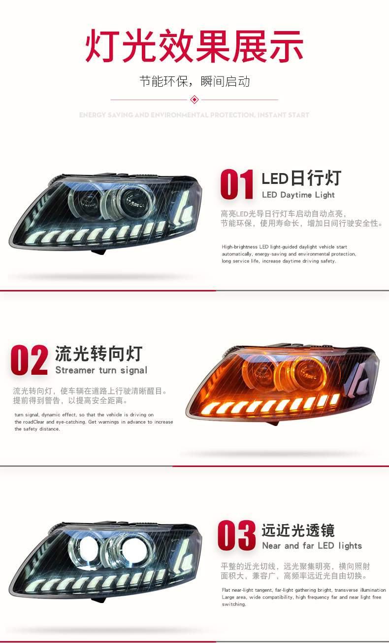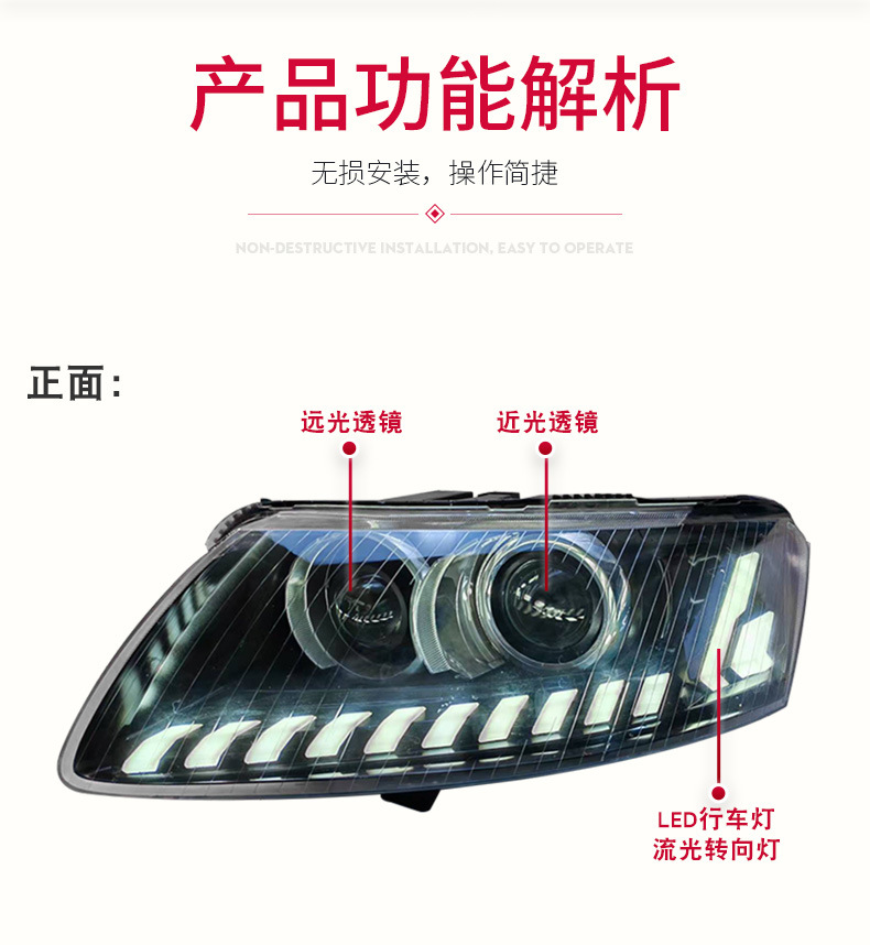- Enhanced Aesthetics & Modern Design: Upgrade your vehicle’s appearance with integrated LED Daytime Running Lights (DRL) and dynamic flowing turn signals. The projector lens design provides a modern look and improved light focus, giving your Audi A6L a refreshed and stylish presence.