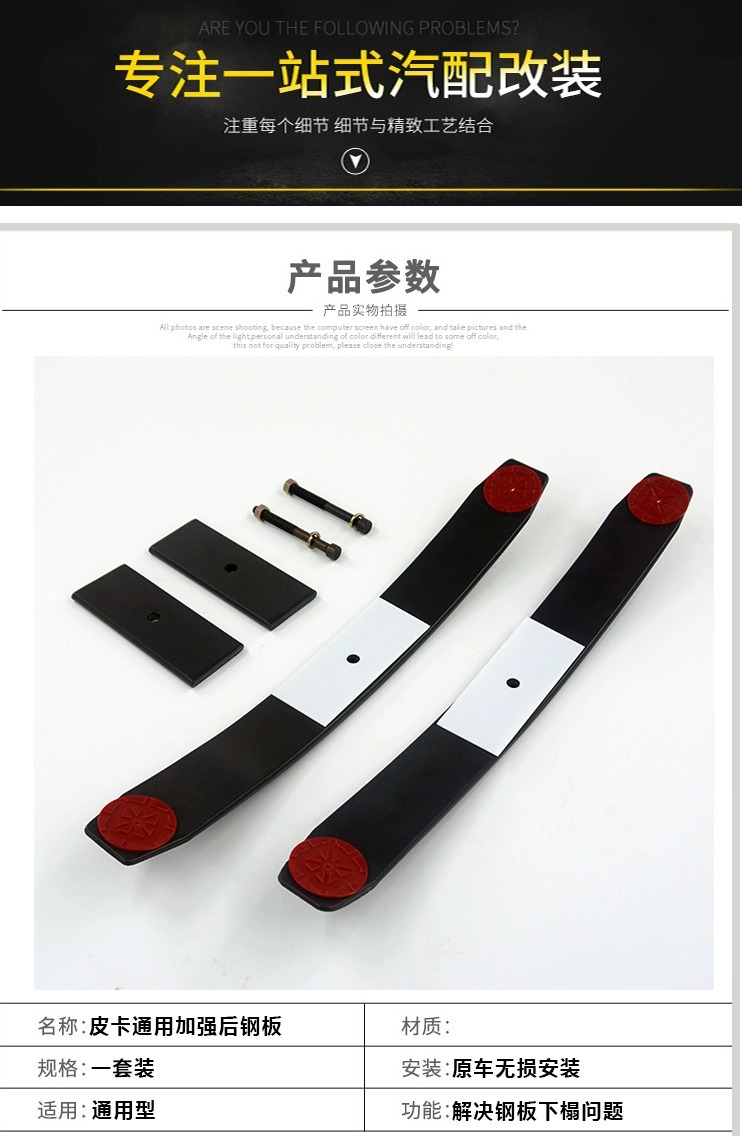 - Direct Fitment: A perfect replacement for adapting leaf springs. Compatible with Nissan Navara, Rich 6, Yuhu, Isuzu Ruimai, D-Max, Dalingzhu pickup trucks.